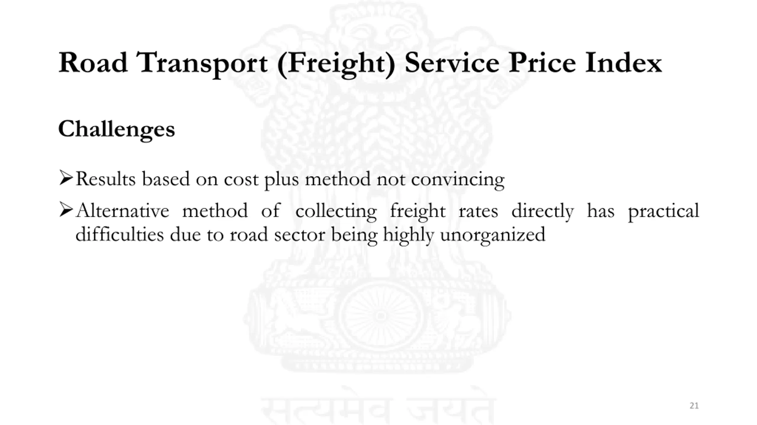 Road Transport (Freight) Service Price Index Challenges Results based on cost plus method not convincing Alternative method of collecting freight rates directly has practical difficulties due to road sector being highly unorganized 21