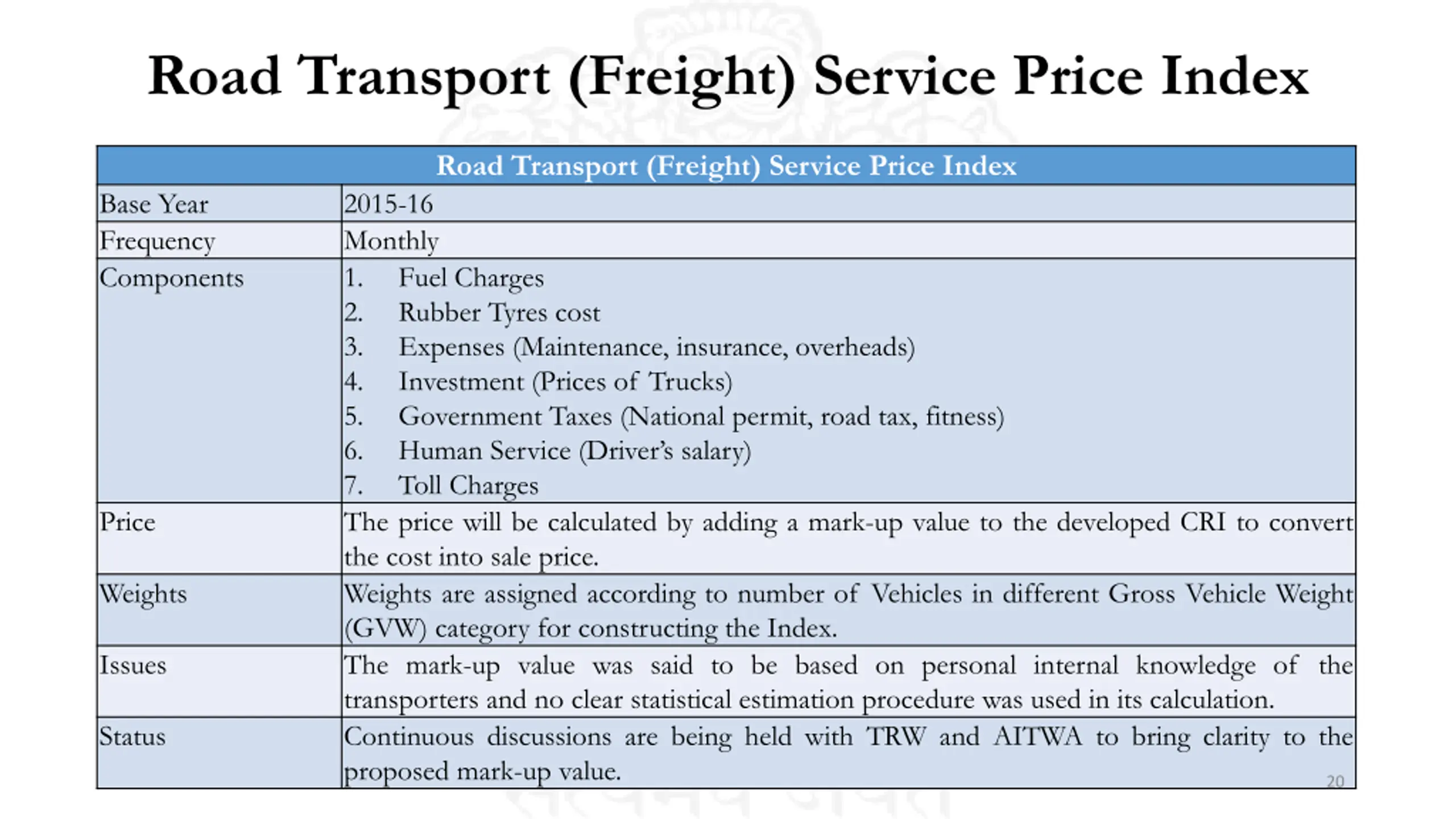 Road Transport (Freight) Service Price Index Road Transport (Freight) Service Price Index Base Year Frequency Components 2015-16 Monthly 1. 2. 3. 4. 5. 6. 7. The price will be calculated by adding a mark-up value to the developed CRI to convert the cost into sale price. Weights are assigned according to number of Vehicles in different Gross Vehicle Weight (GVW) category for constructing the Index. The mark-up value was said to be based on personal internal knowledge of the transporters and no clear statistical estimation procedure was used in its calculation. Continuous discussions are being held with TRW and AITWA to bring clarity to the proposed mark-up value. Fuel Charges Rubber Tyres cost Expenses (Maintenance, insurance, overheads) Investment (Prices of Trucks) Government Taxes (National permit, road tax, fitness) Human Service (Driver s salary) Toll Charges Price Weights Issues Status 20