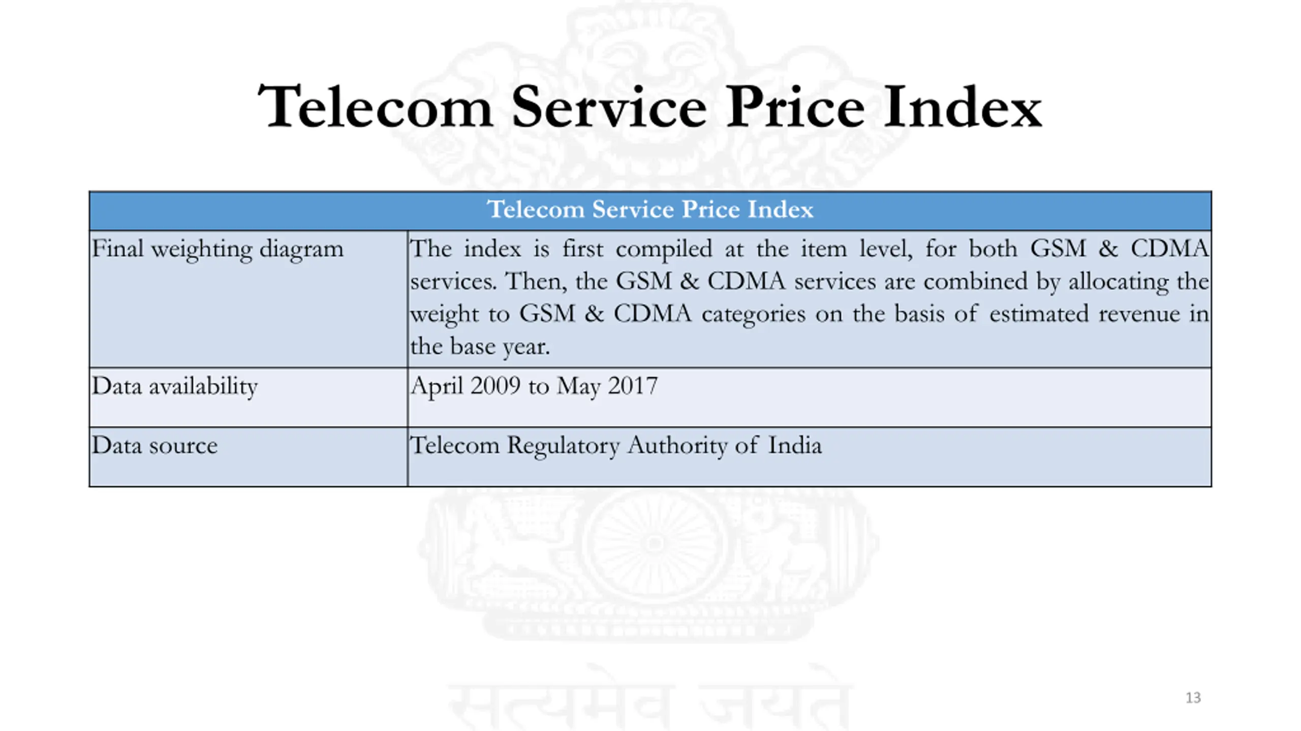 Telecom Service Price Index Telecom Service Price Index The index is first compiled at the item level, for both GSM & CDMA services. Then, the GSM & CDMA services are combined by allocating the weight to GSM & CDMA categories on the basis of estimated revenue in the base year. April 2009 to May 2017 Final weighting diagram Data availability Data source Telecom Regulatory Authority of India 13