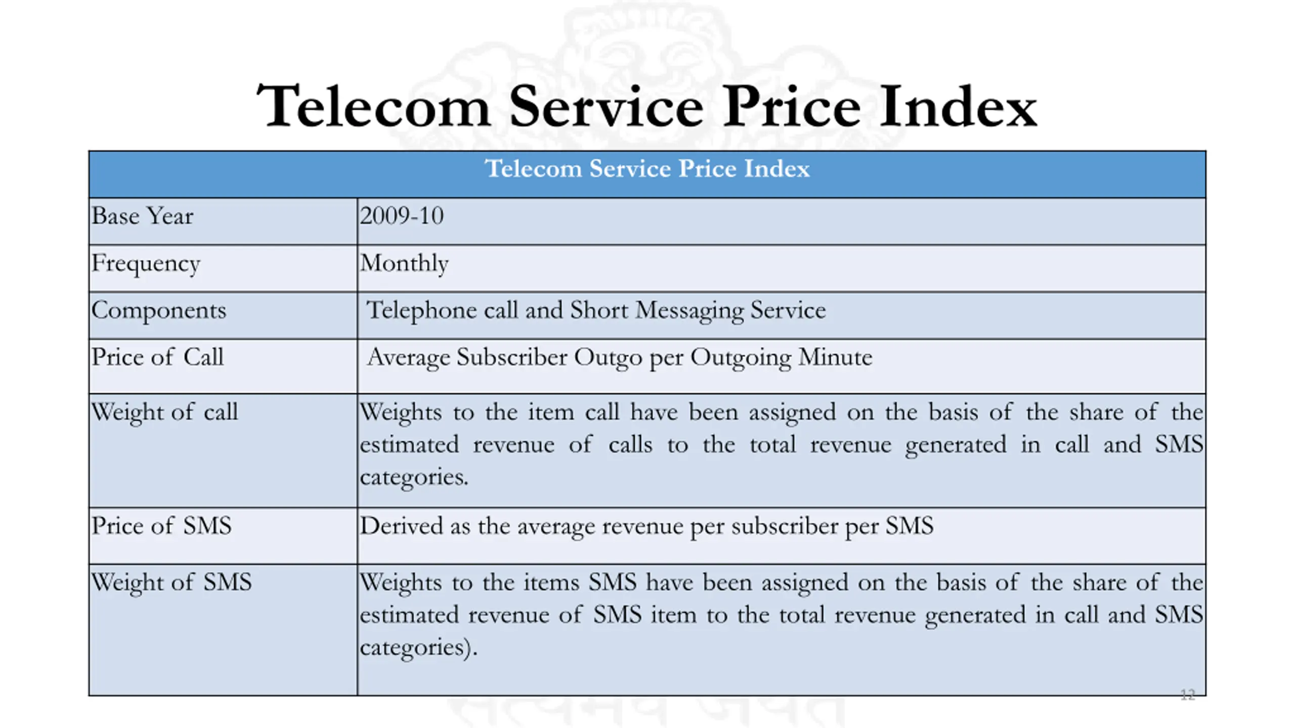 Telecom Service Price Index Telecom Service Price Index Base Year 2009-10 Frequency Monthly Components Telephone call and Short Messaging Service Price of Call Average Subscriber Outgo per Outgoing Minute Weight of call Weights to the item call have been assigned on the basis of the share of the estimated revenue of calls to the total revenue generated in call and SMS categories. Price of SMS Derived as the average revenue per subscriber per SMS Weight of SMS Weights to the items SMS have been assigned on the basis of the share of the estimated revenue of SMS item to the total revenue generated in call and SMS categories). 12