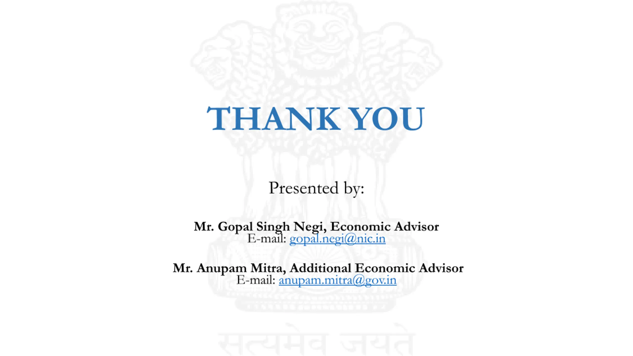 THANK YOU Presented by: Mr. Gopal Singh Negi, Economic Advisor E-mail: gopal.negi@nic.in Mr. Anupam Mitra, Additional Economic Advisor E-mail: anupam.mitra@gov.in