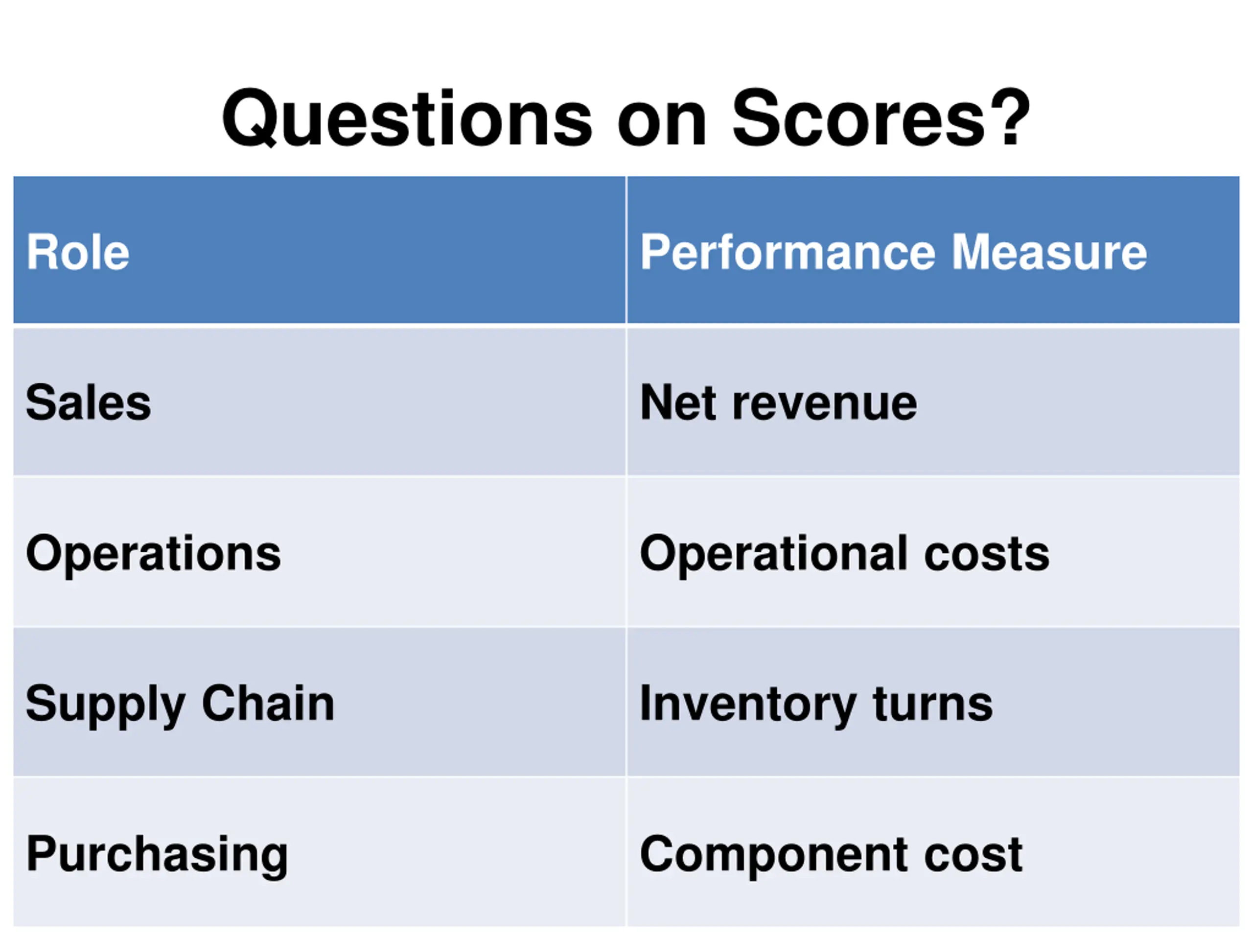Questions on Scores? Role Performance Measure Sales Net revenue Operations Operational costs Supply Chain Inventory turns Purchasing Component cost