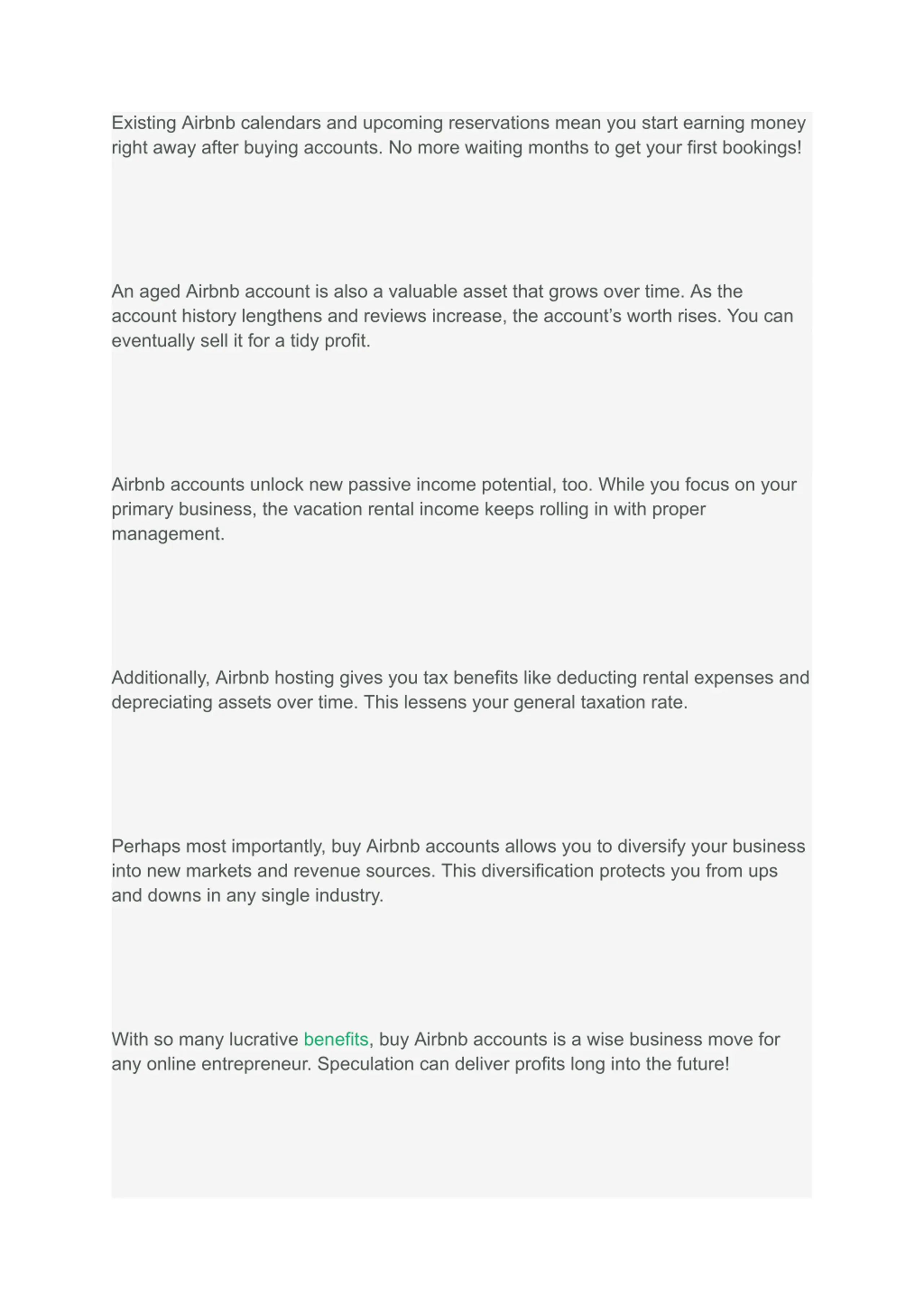 14. Existing Airbnb calendars and upcoming reservations mean you start earning money right away after buying accounts. No more waiting months to get your first bookings! An aged Airbnb account is also a valuable asset that grows over time. As the account history lengthens and reviews increase, the account s worth rises. You can eventually sell it for a tidy profit. Airbnb accounts unlock new passive income potential, too. While you focus on your primary business, the vacation rental income keeps rolling in with proper management. Additionally, Airbnb hosting gives you tax benefits like deducting rental expenses and depreciating assets over time. This lessens your general taxation rate. Perhaps most importantly, buy Airbnb accounts allows you to diversify your business into new markets and revenue sources. This diversification protects you from ups and downs in any single industry. With so many lucrative benefits, buy Airbnb accounts is a wise business move for any online entrepreneur. Speculation can deliver profits long into the future!