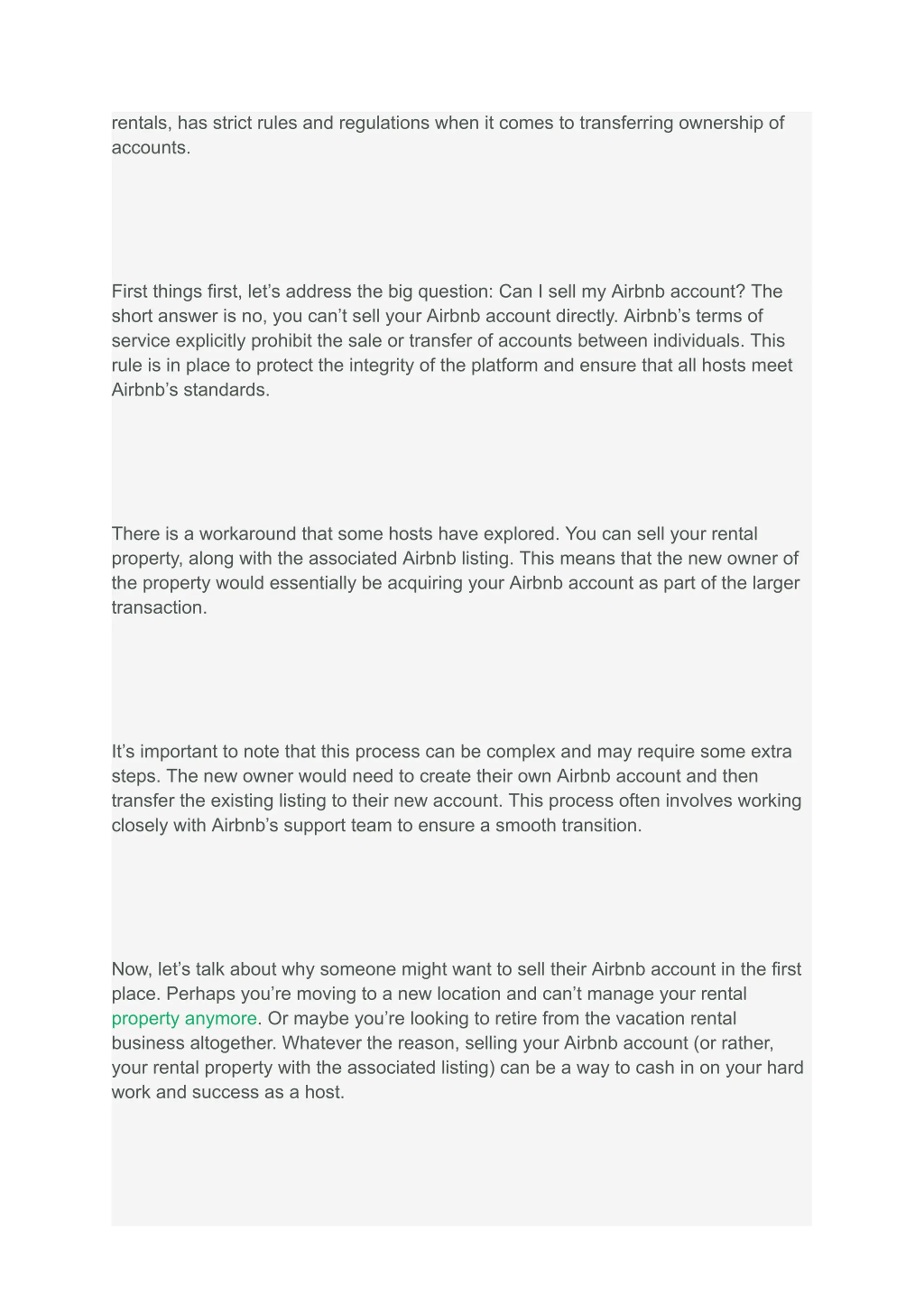 18. Before you decide to sell, its crucial to understand the potential risks and challenges involved. For example, you ll need to ensure that all outstanding bookings and reservations are properly handled during the transition period. Additionally, you ll want to carefully vet potential buyers to ensure they meet Airbnb s hosting requirements and can maintain the high standards you ve set for your listing. If you re considering selling your Airbnb account, it s always a good idea to consult with Airbnb s support team or seek professional guidance from a real estate attorney or broker. They can help you navigate the process and ensure that you re following all necessary rules and regulations. While you can t directly sell your Airbnb account, there are ways to transfer ownership of your rental property and its associated listing to a new owner. Just remember to do your research, follow the proper procedures, and prioritize the safety and satisfaction of your guests throughout the process. Conclusion Buy Airbnb accounts can give your online business a significant boost. With pre-existing listings, reviews, and an established user base, you can hit the ground running and start generating revenue from day one. Here s why buy Airbnb accounts is so important for any online business: Buy Airbnb accounts can be a powerful tool for any online business looking to establish a strong presence in the vacation rental market. With instant credibility, a