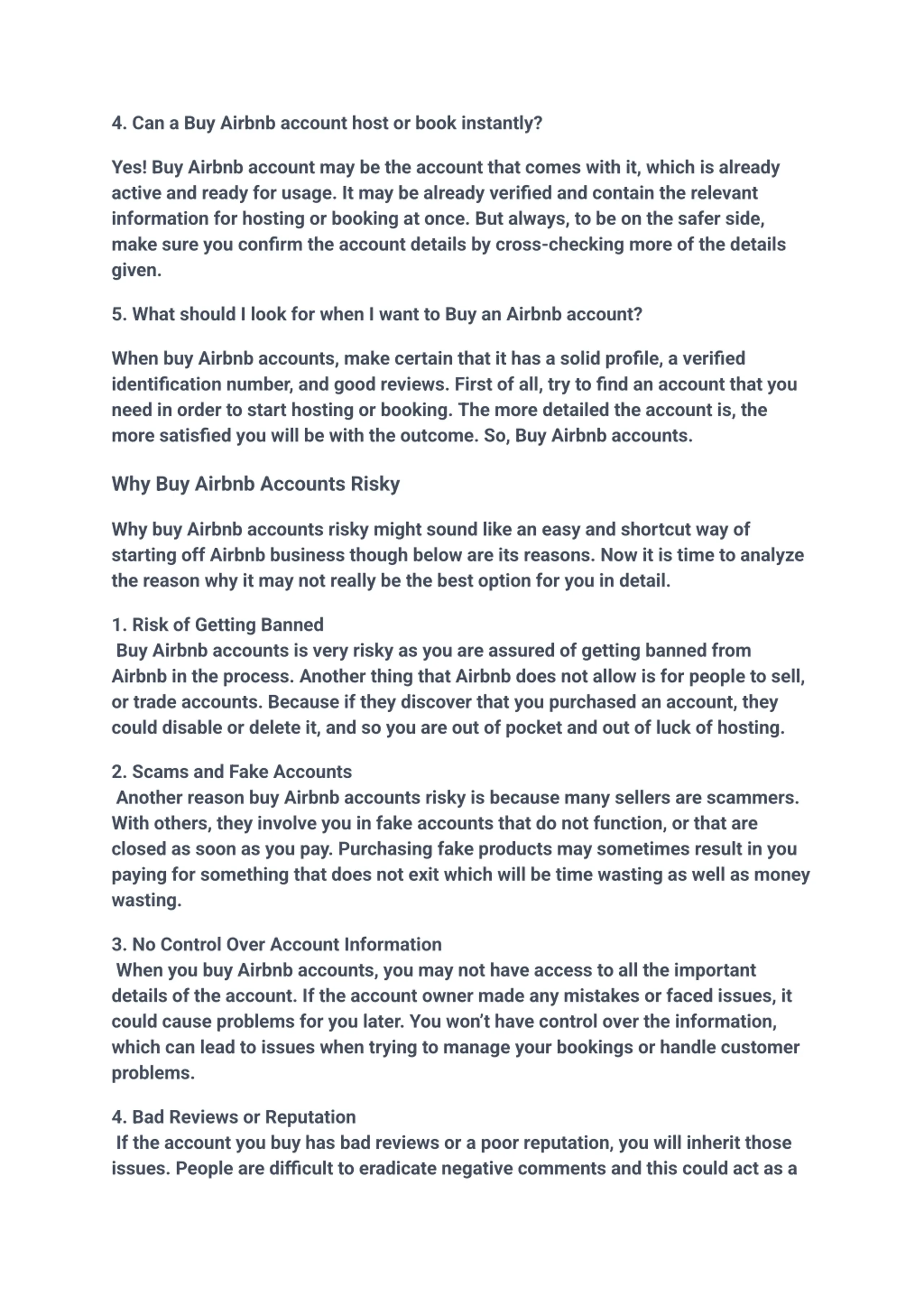 8. 4. Can a Buy Airbnb account host or book instantly? Yes! Buy Airbnb account may be the account that comes with it, which is already active and ready for usage. It may be already verified and contain the relevant information for hosting or booking at once. But always, to be on the safer side, make sure you confirm the account details by cross-checking more of the details given. 5. What should I look for when I want to Buy an Airbnb account? When buy Airbnb accounts, make certain that it has a solid profile, a verified identification number, and good reviews. First of all, try to find an account that you need in order to start hosting or booking. The more detailed the account is, the more satisfied you will be with the outcome. So, Buy Airbnb accounts. Why Buy Airbnb Accounts Risky Why buy Airbnb accounts risky might sound like an easy and shortcut way of starting off Airbnb business though below are its reasons. Now it is time to analyze the reason why it may not really be the best option for you in detail. 1. Risk of Getting Banned Buy Airbnb accounts is very risky as you are assured of getting banned from Airbnb in the process. Another thing that Airbnb does not allow is for people to sell, or trade accounts. Because if they discover that you purchased an account, they could disable or delete it, and so you are out of pocket and out of luck of hosting. 2. Scams and Fake Accounts Another reason buy Airbnb accounts risky is because many sellers are scammers. With others, they involve you in fake accounts that do not function, or that are closed as soon as you pay. Purchasing fake products may sometimes result in you paying for something that does not exit which will be time wasting as well as money wasting. 3. No Control Over Account Information When you buy Airbnb accounts, you may not have access to all the important details of the account. If the account owner made any mistakes or faced issues, it could cause problems for you later. You won t have control over the information, which can lead to issues when trying to manage your bookings or handle customer problems. 4. Bad Reviews or Reputation If the account you buy has bad reviews or a poor reputation, you will inherit those issues. People are difficult to eradicate negative comments and this could act as a