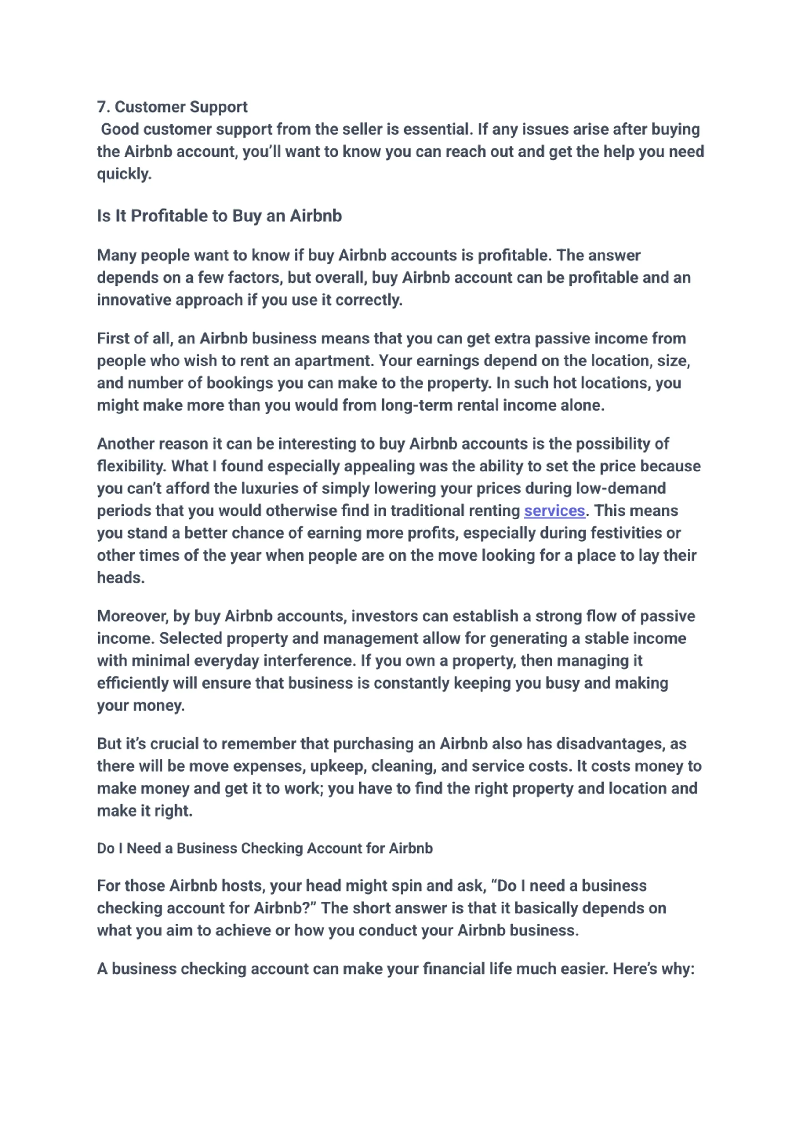 5. 7. Customer Support Good customer support from the seller is essential. If any issues arise after buying the Airbnb account, you ll want to know you can reach out and get the help you need quickly. Is It Profitable to Buy an Airbnb Many people want to know if buy Airbnb accounts is profitable. The answer depends on a few factors, but overall, buy Airbnb account can be profitable and an innovative approach if you use it correctly. First of all, an Airbnb business means that you can get extra passive income from people who wish to rent an apartment. Your earnings depend on the location, size, and number of bookings you can make to the property. In such hot locations, you might make more than you would from long-term rental income alone. Another reason it can be interesting to buy Airbnb accounts is the possibility of flexibility. What I found especially appealing was the ability to set the price because you can t afford the luxuries of simply lowering your prices during low-demand periods that you would otherwise find in traditional renting services. This means you stand a better chance of earning more profits, especially during festivities or other times of the year when people are on the move looking for a place to lay their heads. Moreover, by buy Airbnb accounts, investors can establish a strong flow of passive income. Selected property and management allow for generating a stable income with minimal everyday interference. If you own a property, then managing it efficiently will ensure that business is constantly keeping you busy and making your money. But it s crucial to remember that purchasing an Airbnb also has disadvantages, as there will be move expenses, upkeep, cleaning, and service costs. It costs money to make money and get it to work; you have to find the right property and location and make it right. Do I Need a Business Checking Account for Airbnb For those Airbnb hosts, your head might spin and ask, Do I need a business checking account for Airbnb? The short answer is that it basically depends on what you aim to achieve or how you conduct your Airbnb business. A business checking account can make your financial life much easier. Here s why: