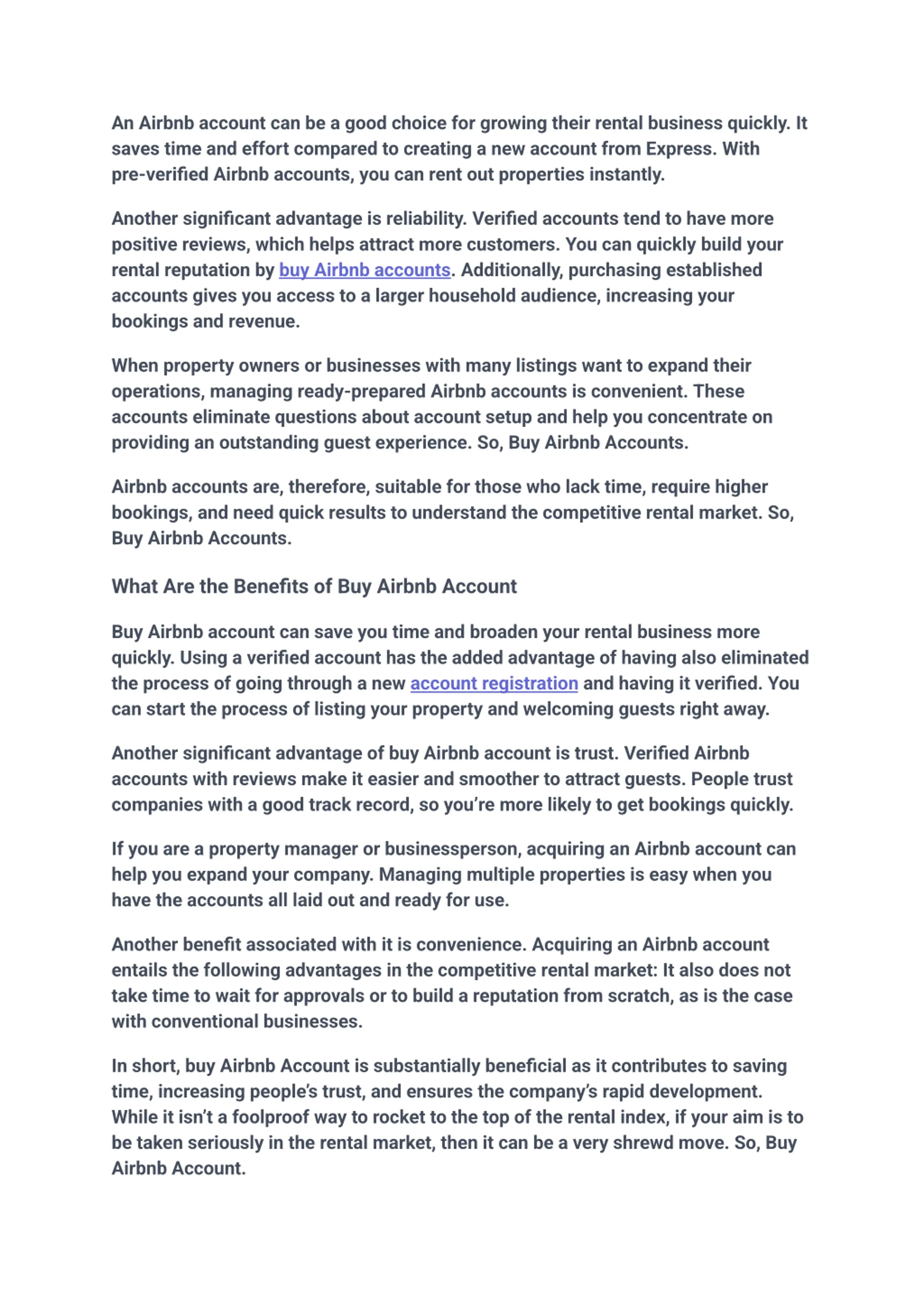 2. An Airbnb account can be a good choice for growing their rental business quickly. It saves time and effort compared to creating a new account from Express. With pre-verified Airbnb accounts, you can rent out properties instantly. Another significant advantage is reliability. Verified accounts tend to have more positive reviews, which helps attract more customers. You can quickly build your rental reputation by buy Airbnb accounts. Additionally, purchasing established accounts gives you access to a larger household audience, increasing your bookings and revenue. When property owners or businesses with many listings want to expand their operations, managing ready-prepared Airbnb accounts is convenient. These accounts eliminate questions about account setup and help you concentrate on providing an outstanding guest experience. So, Buy Airbnb Accounts. Airbnb accounts are, therefore, suitable for those who lack time, require higher bookings, and need quick results to understand the competitive rental market. So, Buy Airbnb Accounts. What Are the Benefits of Buy Airbnb Account Buy Airbnb account can save you time and broaden your rental business more quickly. Using a verified account has the added advantage of having also eliminated the process of going through a new account registration and having it verified. You can start the process of listing your property and welcoming guests right away. Another significant advantage of buy Airbnb account is trust. Verified Airbnb accounts with reviews make it easier and smoother to attract guests. People trust companies with a good track record, so you re more likely to get bookings quickly. If you are a property manager or businessperson, acquiring an Airbnb account can help you expand your company. Managing multiple properties is easy when you have the accounts all laid out and ready for use. Another benefit associated with it is convenience. Acquiring an Airbnb account entails the following advantages in the competitive rental market: It also does not take time to wait for approvals or to build a reputation from scratch, as is the case with conventional businesses. In short, buy Airbnb Account is substantially beneficial as it contributes to saving time, increasing people s trust, and ensures the company s rapid development. While it isn t a foolproof way to rocket to the top of the rental index, if your aim is to be taken seriously in the rental market, then it can be a very shrewd move. So, Buy Airbnb Account.