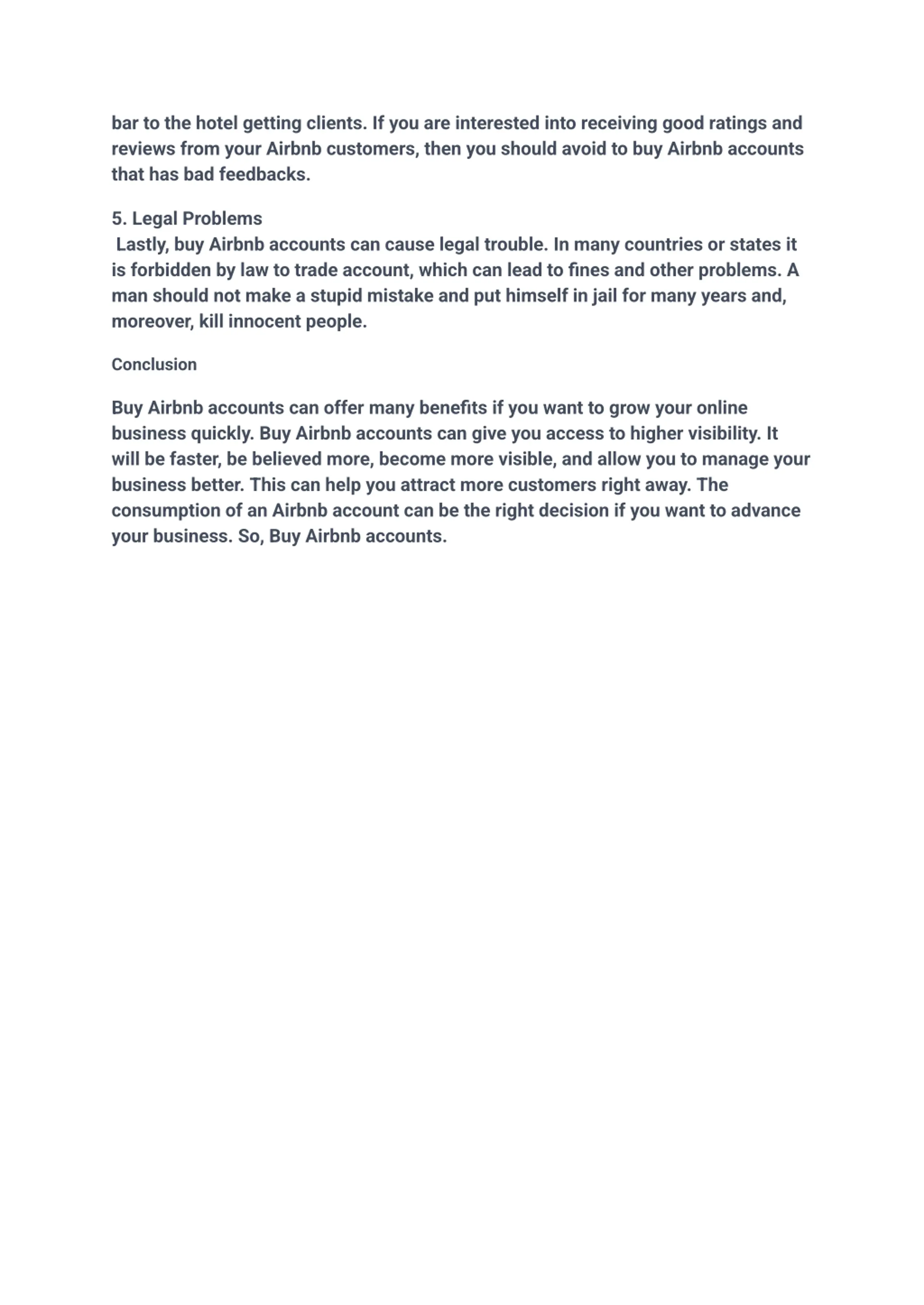 9. bar to the hotel getting clients. If you are interested into receiving good ratings and reviews from your Airbnb customers, then you should avoid to buy Airbnb accounts that has bad feedbacks. 5. Legal Problems Lastly, buy Airbnb accounts can cause legal trouble. In many countries or states it is forbidden by law to trade account, which can lead to fines and other problems. A man should not make a stupid mistake and put himself in jail for many years and, moreover, kill innocent people. Conclusion Buy Airbnb accounts can offer many benefits if you want to grow your online business quickly. Buy Airbnb accounts can give you access to higher visibility. It will be faster, be believed more, become more visible, and allow you to manage your business better. This can help you attract more customers right away. The consumption of an Airbnb account can be the right decision if you want to advance your business. So, Buy Airbnb accounts.