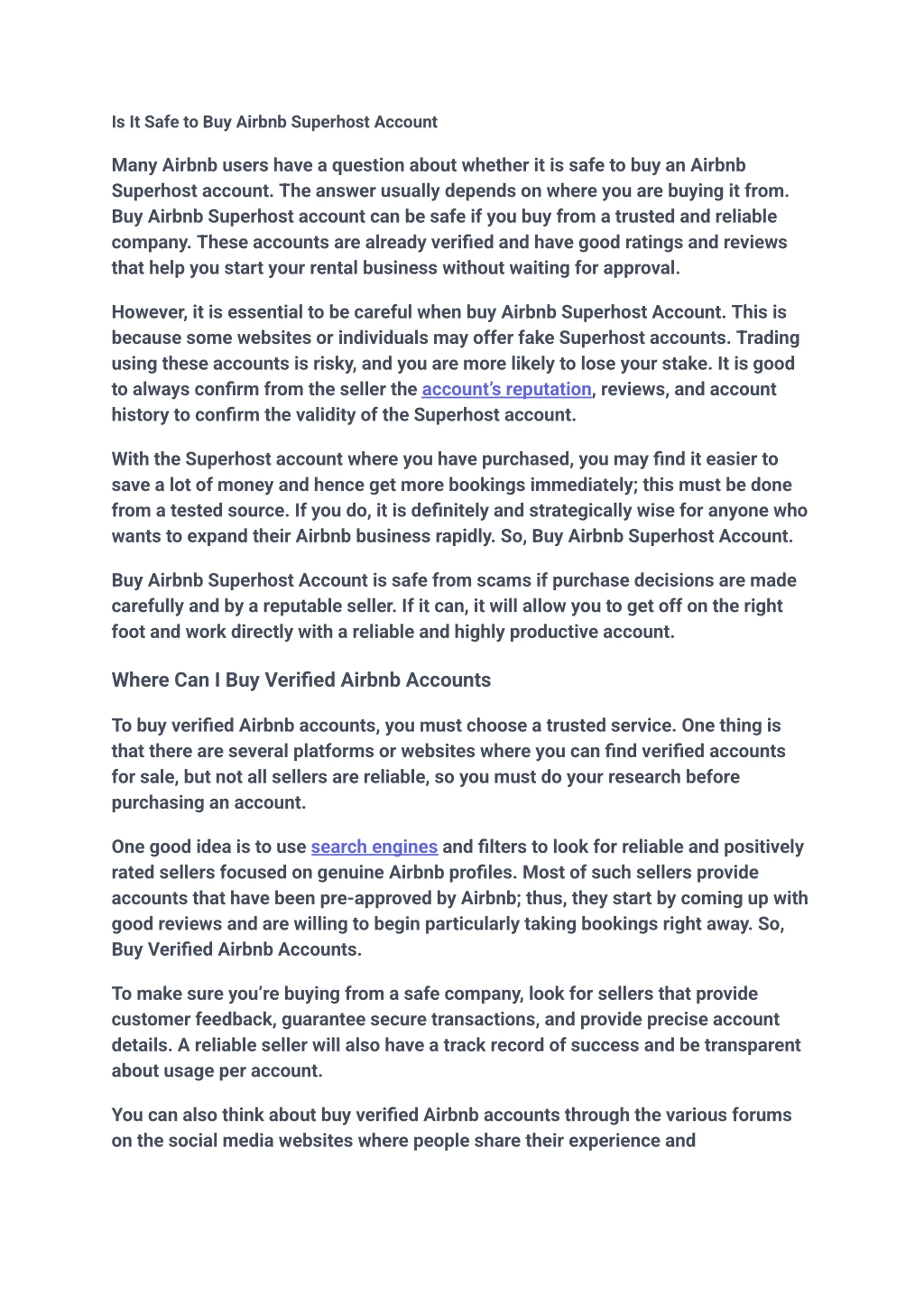 3. Is It Safe to Buy Airbnb Superhost Account Many Airbnb users have a question about whether it is safe to buy an Airbnb Superhost account. The answer usually depends on where you are buying it from. Buy Airbnb Superhost account can be safe if you buy from a trusted and reliable company. These accounts are already verified and have good ratings and reviews that help you start your rental business without waiting for approval. However, it is essential to be careful when buy Airbnb Superhost Account. This is because some websites or individuals may offer fake Superhost accounts. Trading using these accounts is risky, and you are more likely to lose your stake. It is good to always confirm from the seller the account s reputation, reviews, and account history to confirm the validity of the Superhost account. With the Superhost account where you have purchased, you may find it easier to save a lot of money and hence get more bookings immediately; this must be done from a tested source. If you do, it is definitely and strategically wise for anyone who wants to expand their Airbnb business rapidly. So, Buy Airbnb Superhost Account. Buy Airbnb Superhost Account is safe from scams if purchase decisions are made carefully and by a reputable seller. If it can, it will allow you to get off on the right foot and work directly with a reliable and highly productive account. Where Can I Buy Verified Airbnb Accounts To buy verified Airbnb accounts, you must choose a trusted service. One thing is that there are several platforms or websites where you can find verified accounts for sale, but not all sellers are reliable, so you must do your research before purchasing an account. One good idea is to use search engines and filters to look for reliable and positively rated sellers focused on genuine Airbnb profiles. Most of such sellers provide accounts that have been pre-approved by Airbnb; thus, they start by coming up with good reviews and are willing to begin particularly taking bookings right away. So, Buy Verified Airbnb Accounts. To make sure you re buying from a safe company, look for sellers that provide customer feedback, guarantee secure transactions, and provide precise account details. A reliable seller will also have a track record of success and be transparent about usage per account. You can also think about buy verified Airbnb accounts through the various forums on the social media websites where people share their experience and
