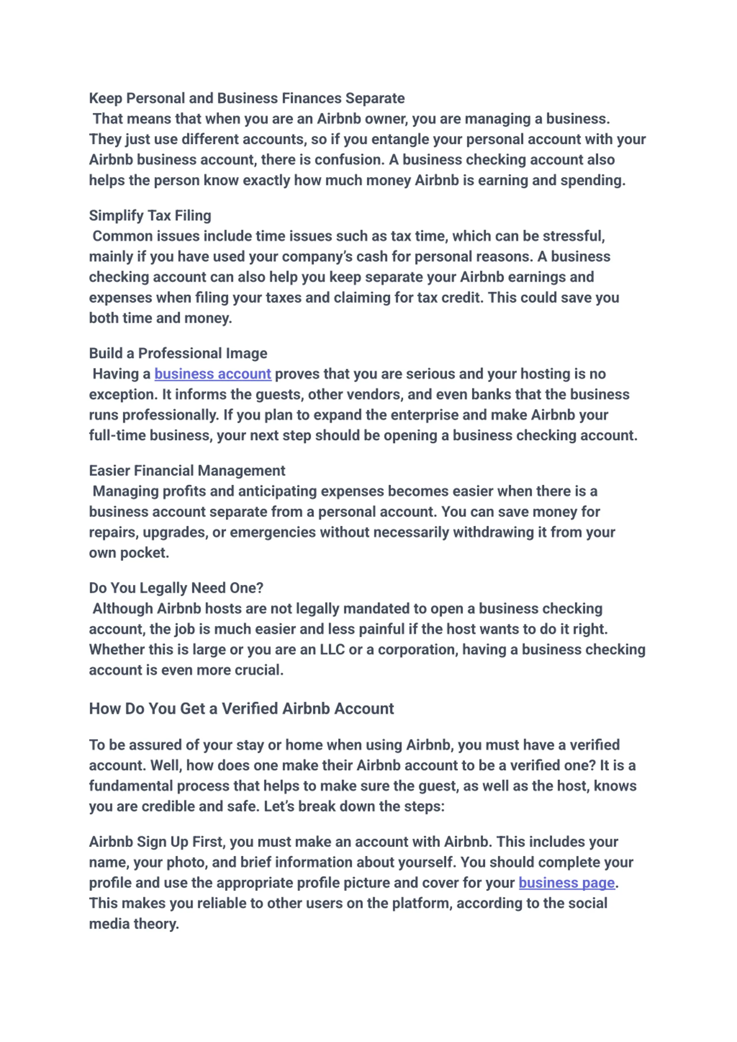 6. Keep Personal and Business Finances Separate That means that when you are an Airbnb owner, you are managing a business. They just use different accounts, so if you entangle your personal account with your Airbnb business account, there is confusion. A business checking account also helps the person know exactly how much money Airbnb is earning and spending. Simplify Tax Filing Common issues include time issues such as tax time, which can be stressful, mainly if you have used your company s cash for personal reasons. A business checking account can also help you keep separate your Airbnb earnings and expenses when filing your taxes and claiming for tax credit. This could save you both time and money. Build a Professional Image Having a business account proves that you are serious and your hosting is no exception. It informs the guests, other vendors, and even banks that the business runs professionally. If you plan to expand the enterprise and make Airbnb your full-time business, your next step should be opening a business checking account. Easier Financial Management Managing profits and anticipating expenses becomes easier when there is a business account separate from a personal account. You can save money for repairs, upgrades, or emergencies without necessarily withdrawing it from your own pocket. Do You Legally Need One? Although Airbnb hosts are not legally mandated to open a business checking account, the job is much easier and less painful if the host wants to do it right. Whether this is large or you are an LLC or a corporation, having a business checking account is even more crucial. How Do You Get a Verified Airbnb Account To be assured of your stay or home when using Airbnb, you must have a verified account. Well, how does one make their Airbnb account to be a verified one? It is a fundamental process that helps to make sure the guest, as well as the host, knows you are credible and safe. Let s break down the steps: Airbnb Sign Up First, you must make an account with Airbnb. This includes your name, your photo, and brief information about yourself. You should complete your profile and use the appropriate profile picture and cover for your business page. This makes you reliable to other users on the platform, according to the social media theory.
