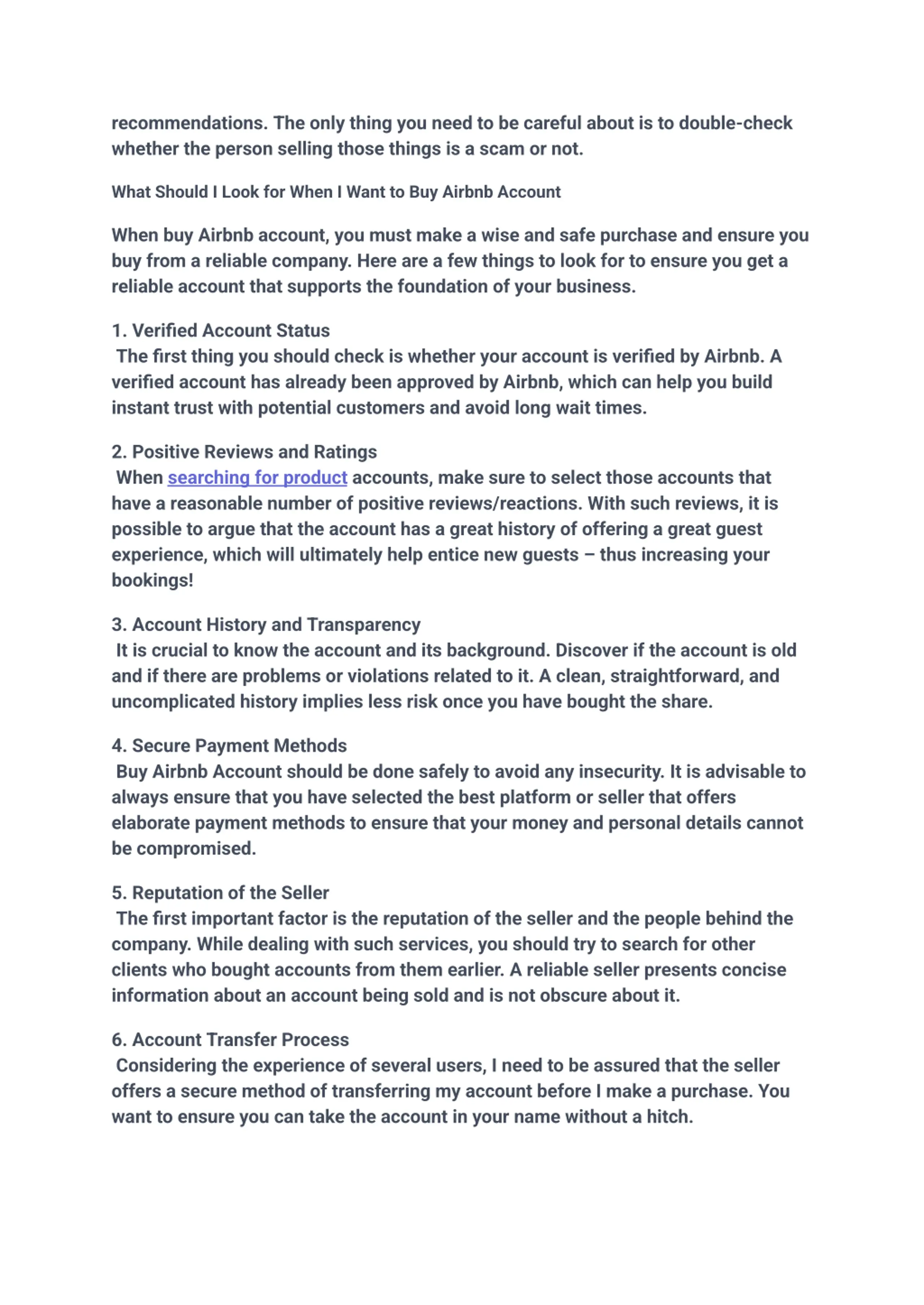 4. recommendations. The only thing you need to be careful about is to double-check whether the person selling those things is a scam or not. What Should I Look for When I Want to Buy Airbnb Account When buy Airbnb account, you must make a wise and safe purchase and ensure you buy from a reliable company. Here are a few things to look for to ensure you get a reliable account that supports the foundation of your business. 1. Verified Account Status The first thing you should check is whether your account is verified by Airbnb. A verified account has already been approved by Airbnb, which can help you build instant trust with potential customers and avoid long wait times. 2. Positive Reviews and Ratings When searching for product accounts, make sure to select those accounts that have a reasonable number of positive reviews/reactions. With such reviews, it is possible to argue that the account has a great history of offering a great guest experience, which will ultimately help entice new guests thus increasing your bookings! 3. Account History and Transparency It is crucial to know the account and its background. Discover if the account is old and if there are problems or violations related to it. A clean, straightforward, and uncomplicated history implies less risk once you have bought the share. 4. Secure Payment Methods Buy Airbnb Account should be done safely to avoid any insecurity. It is advisable to always ensure that you have selected the best platform or seller that offers elaborate payment methods to ensure that your money and personal details cannot be compromised. 5. Reputation of the Seller The first important factor is the reputation of the seller and the people behind the company. While dealing with such services, you should try to search for other clients who bought accounts from them earlier. A reliable seller presents concise information about an account being sold and is not obscure about it. 6. Account Transfer Process Considering the experience of several users, I need to be assured that the seller offers a secure method of transferring my account before I make a purchase. You want to ensure you can take the account in your name without a hitch.