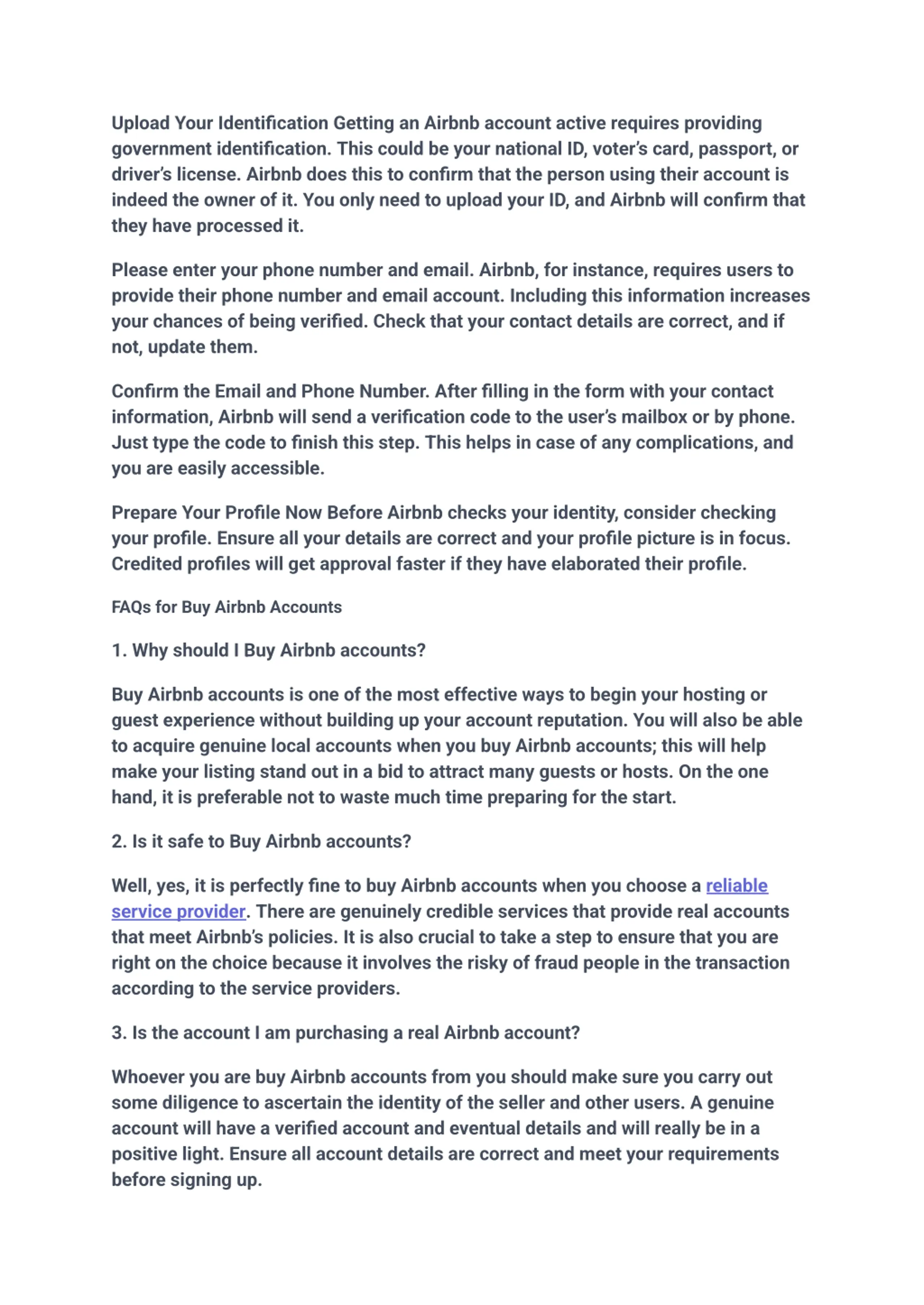 7. Upload Your Identification Getting an Airbnb account active requires providing government identification. This could be your national ID, voter s card, passport, or driver s license. Airbnb does this to confirm that the person using their account is indeed the owner of it. You only need to upload your ID, and Airbnb will confirm that they have processed it. Please enter your phone number and email. Airbnb, for instance, requires users to provide their phone number and email account. Including this information increases your chances of being verified. Check that your contact details are correct, and if not, update them. Confirm the Email and Phone Number. After filling in the form with your contact information, Airbnb will send a verification code to the user s mailbox or by phone. Just type the code to finish this step. This helps in case of any complications, and you are easily accessible. Prepare Your Profile Now Before Airbnb checks your identity, consider checking your profile. Ensure all your details are correct and your profile picture is in focus. Credited profiles will get approval faster if they have elaborated their profile. FAQs for Buy Airbnb Accounts 1. Why should I Buy Airbnb accounts? Buy Airbnb accounts is one of the most effective ways to begin your hosting or guest experience without building up your account reputation. You will also be able to acquire genuine local accounts when you buy Airbnb accounts; this will help make your listing stand out in a bid to attract many guests or hosts. On the one hand, it is preferable not to waste much time preparing for the start. 2. Is it safe to Buy Airbnb accounts? Well, yes, it is perfectly fine to buy Airbnb accounts when you choose a reliable service provider. There are genuinely credible services that provide real accounts that meet Airbnb s policies. It is also crucial to take a step to ensure that you are right on the choice because it involves the risky of fraud people in the transaction according to the service providers. 3. Is the account I am purchasing a real Airbnb account? Whoever you are buy Airbnb accounts from you should make sure you carry out some diligence to ascertain the identity of the seller and other users. A genuine account will have a verified account and eventual details and will really be in a positive light. Ensure all account details are correct and meet your requirements before signing up.