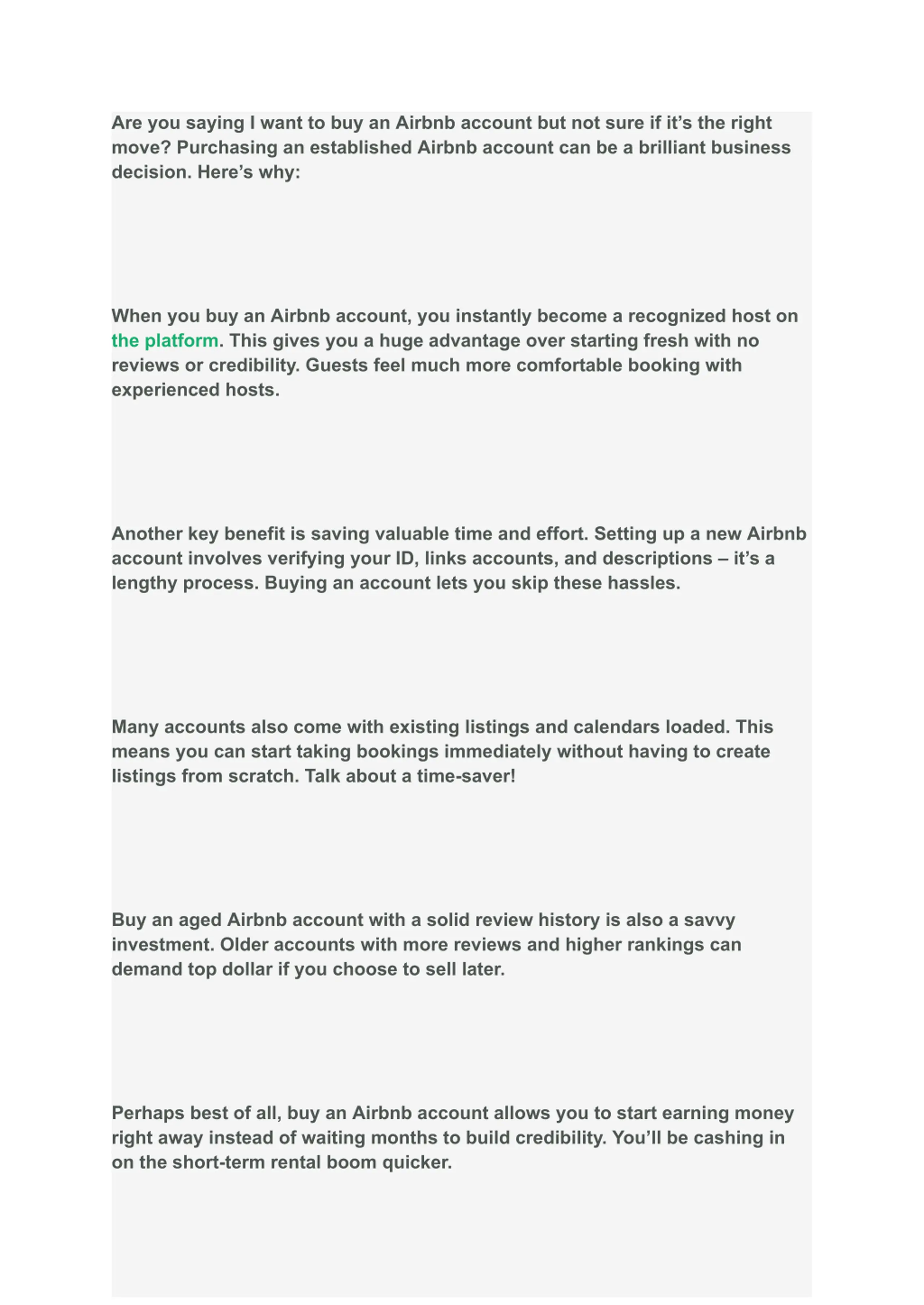 Why Should You Buy an Airbnb Account? Buy Airbnb accounts. Do you want to start an Airbnb business but don t have the time to build a new account from scratch? Buy an Airbnb Account is the perfect solution! With an established account, you can hit the ground running and start making money right away. One of the biggest advantages of buy an Airbnb Account is the existing reviews and ratings. These act as social proof, giving potential guests