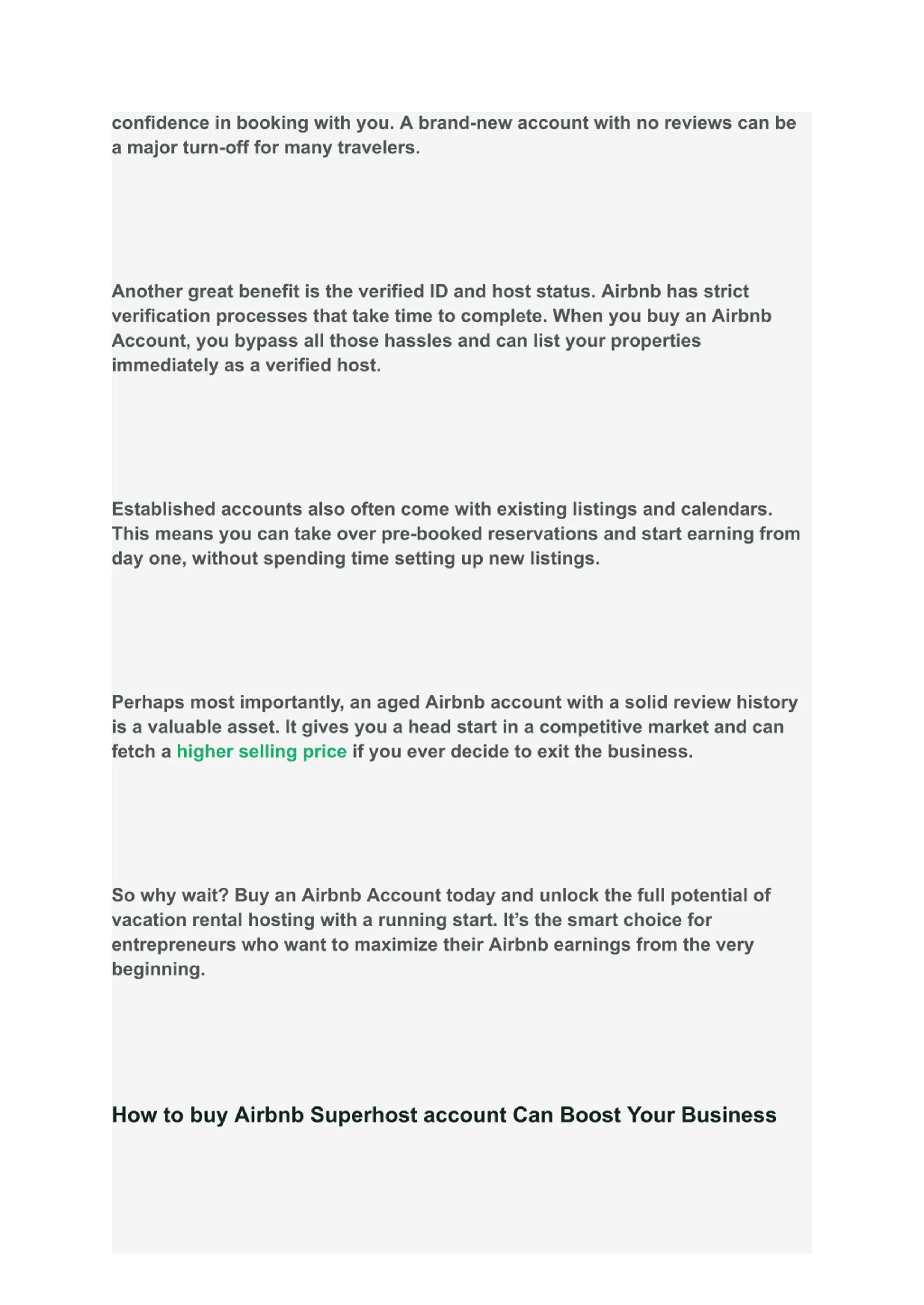 confidence in booking with you. A brand-new account with no reviews can be a major turn-off for many travelers. Another great benefit is the verified ID and host status. Airbnb has strict verification processes that take time to complete. When you buy an Airbnb Account, you bypass all those hassles and can list your properties immediately as a verified host. Established accounts also often come with existing listings and calendars. This means you can take over pre-booked reservations and start earning from day one, without spending time setting up new listings. Perhaps most importantly, an aged Airbnb account with a solid review history is a valuable asset. It gives you a head start in a competitive market and can fetch a higher selling price if you ever decide to exit the business. So why wait? Buy an Airbnb Account today and unlock the full potential of vacation rental hosting with a running start. It s the smart choice for entrepreneurs who want to maximize their Airbnb earnings from the very beginning. How to buy Airbnb Superhost account Can Boost Your Business