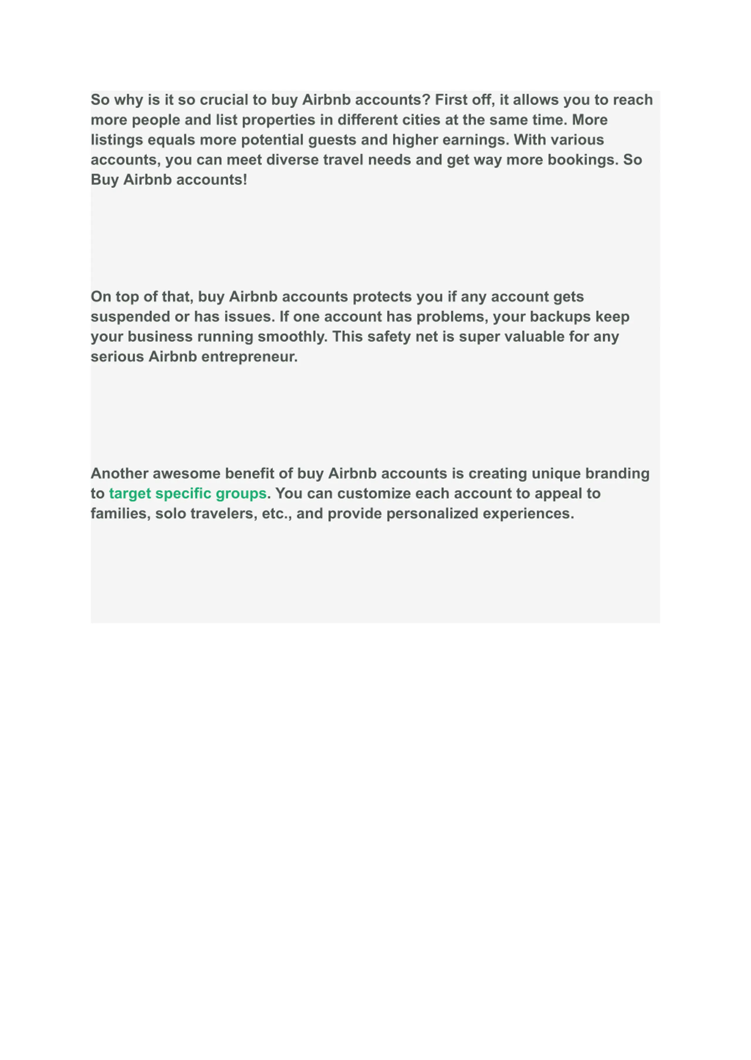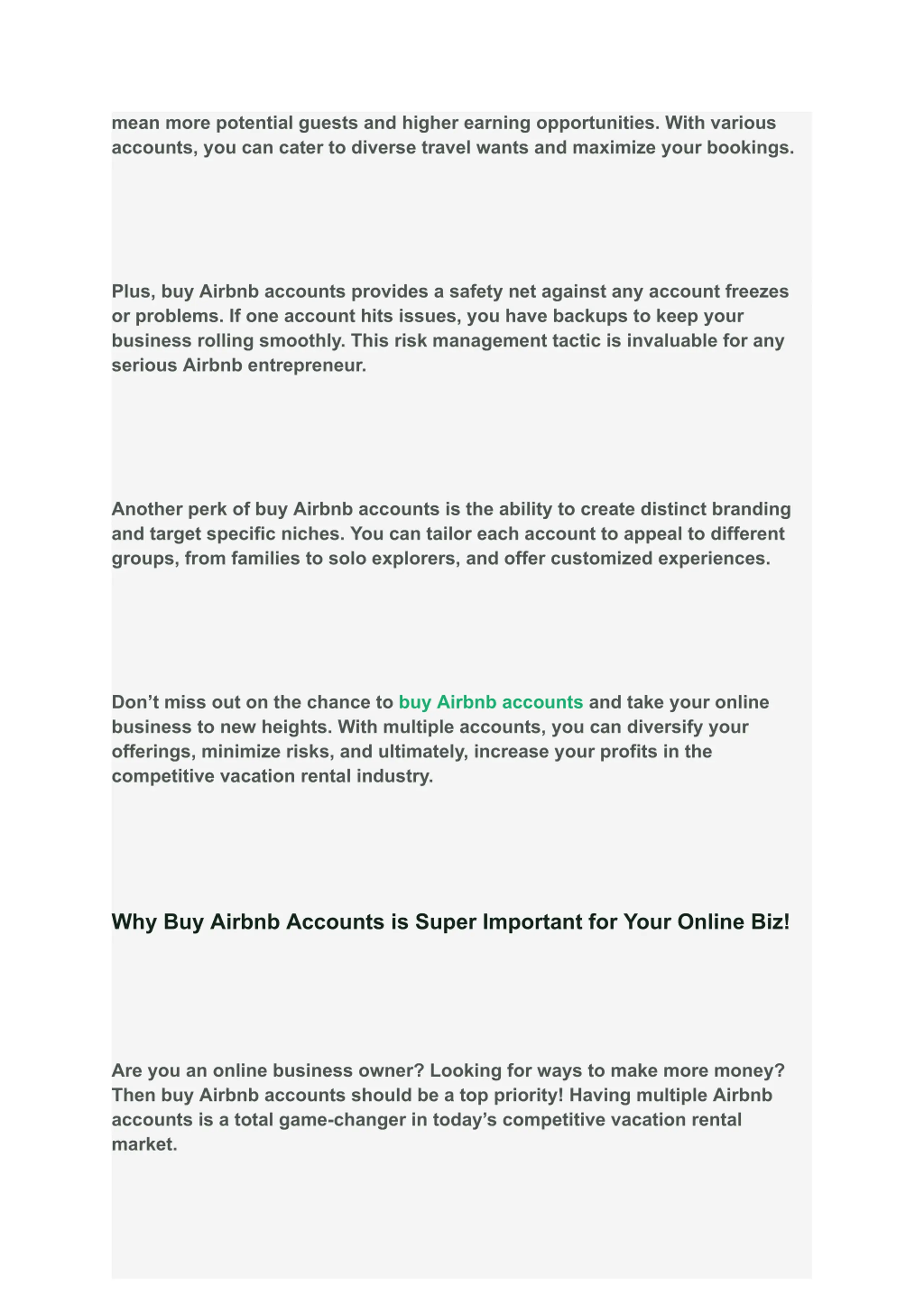 mean more potential guests and higher earning opportunities. With various accounts, you can cater to diverse travel wants and maximize your bookings. Plus, buy Airbnb accounts provides a safety net against any account freezes or problems. If one account hits issues, you have backups to keep your business rolling smoothly. This risk management tactic is invaluable for any serious Airbnb entrepreneur. Another perk of buy Airbnb accounts is the ability to create distinct branding and target specific niches. You can tailor each account to appeal to different groups, from families to solo explorers, and offer customized experiences. Don t miss out on the chance to buy Airbnb accounts and take your online business to new heights. With multiple accounts, you can diversify your offerings, minimize risks, and ultimately, increase your profits in the competitive vacation rental industry. Why Buy Airbnb Accounts is Super Important for Your Online Biz! Are you an online business owner? Looking for ways to make more money? Then buy Airbnb accounts should be a top priority! Having multiple Airbnb accounts is a total game-changer in today s competitive vacation rental market.