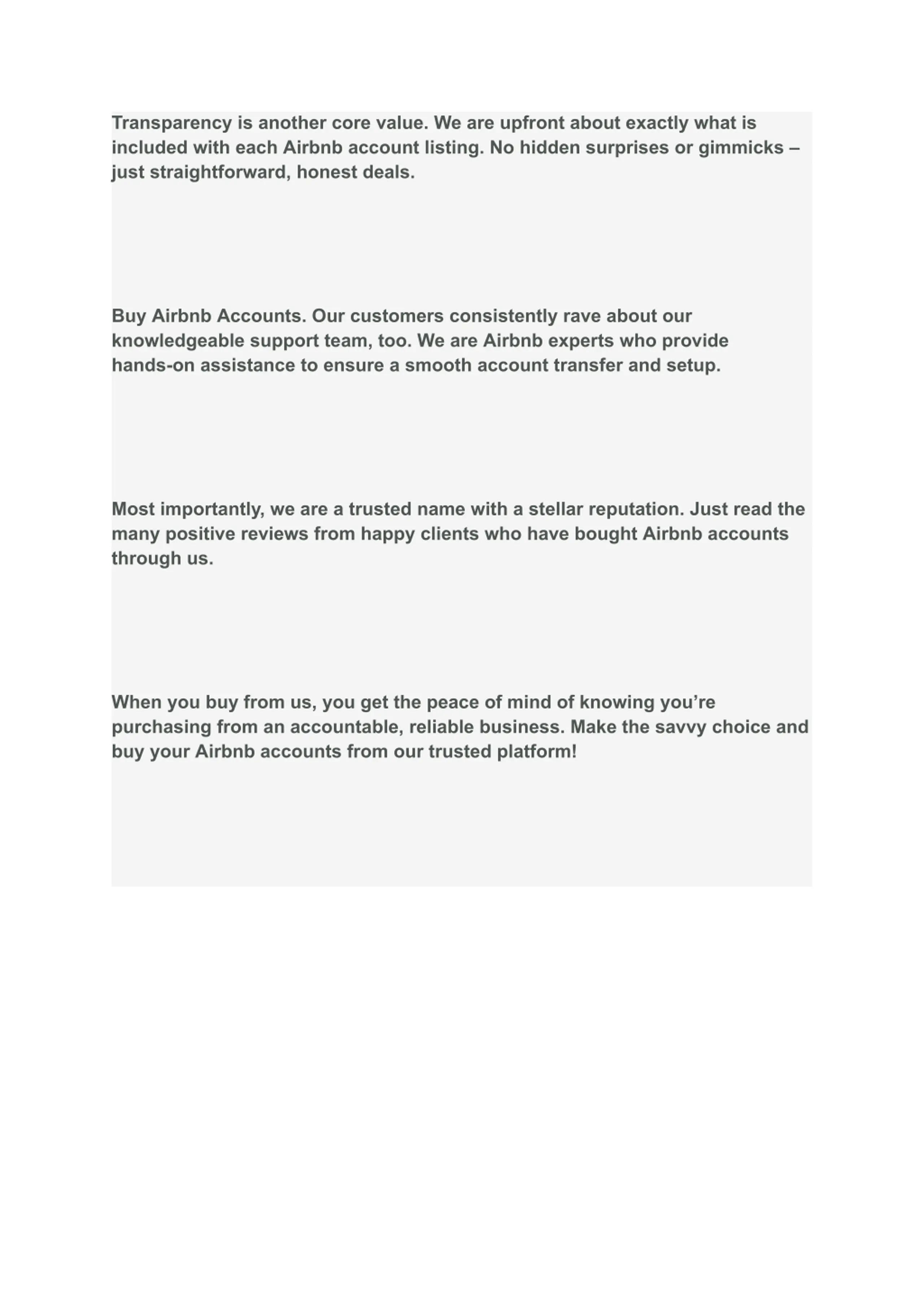 Transparency is another core value. We are upfront about exactly what is included with each Airbnb account listing. No hidden surprises or gimmicks just straightforward, honest deals. Buy Airbnb Accounts. Our customers consistently rave about our knowledgeable support team, too. We are Airbnb experts who provide hands-on assistance to ensure a smooth account transfer and setup. Most importantly, we are a trusted name with a stellar reputation. Just read the many positive reviews from happy clients who have bought Airbnb accounts through us. When you buy from us, you get the peace of mind of knowing you re purchasing from an accountable, reliable business. Make the savvy choice and buy your Airbnb accounts from our trusted platform!