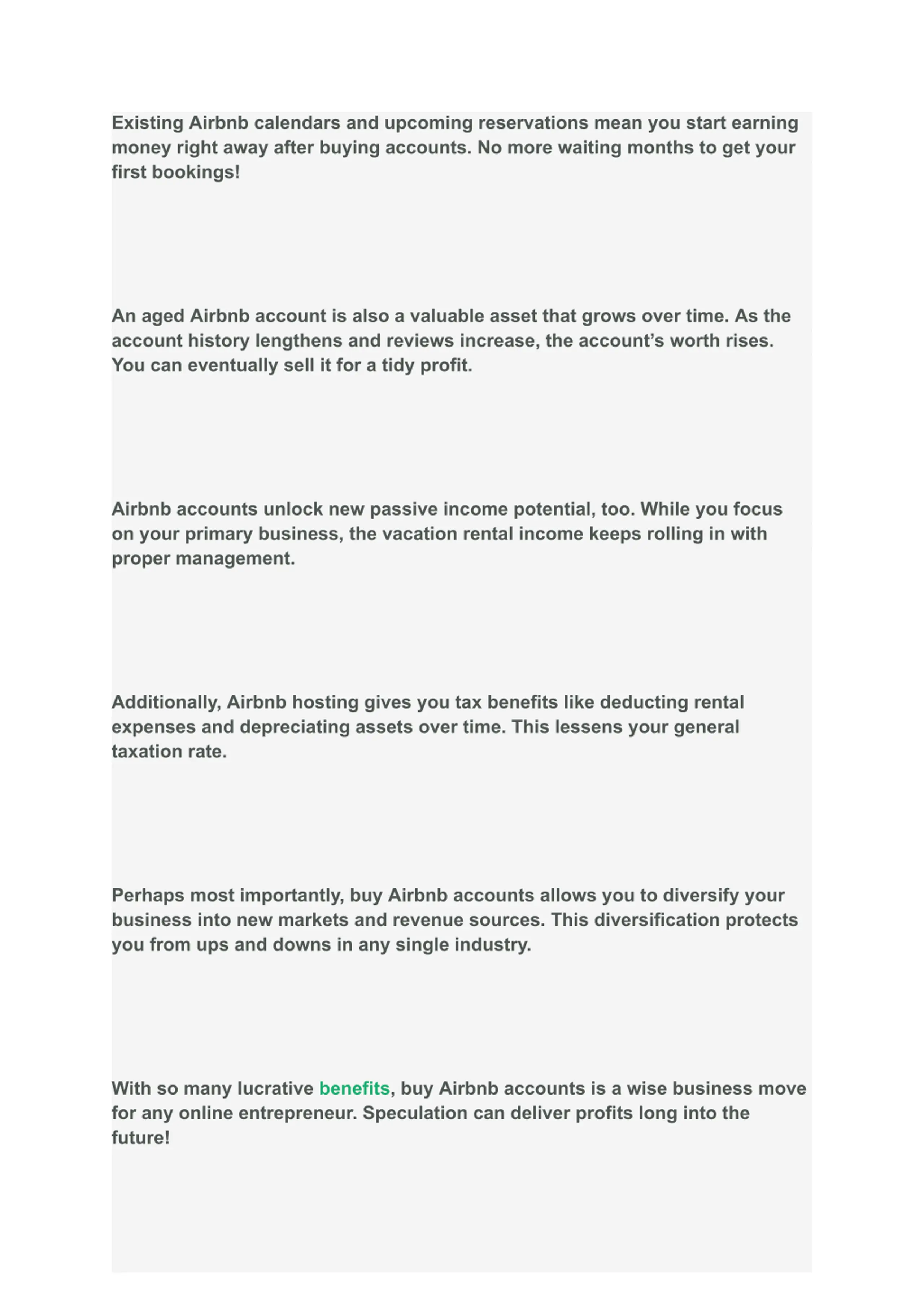 15. Existing Airbnb calendars and upcoming reservations mean you start earning money right away after buying accounts. No more waiting months to get your first bookings! An aged Airbnb account is also a valuable asset that grows over time. As the account history lengthens and reviews increase, the account s worth rises. You can eventually sell it for a tidy profit. Airbnb accounts unlock new passive income potential, too. While you focus on your primary business, the vacation rental income keeps rolling in with proper management. Additionally, Airbnb hosting gives you tax benefits like deducting rental expenses and depreciating assets over time. This lessens your general taxation rate. Perhaps most importantly, buy Airbnb accounts allows you to diversify your business into new markets and revenue sources. This diversification protects you from ups and downs in any single industry. With so many lucrative benefits, buy Airbnb accounts is a wise business move for any online entrepreneur. Speculation can deliver profits long into the future!