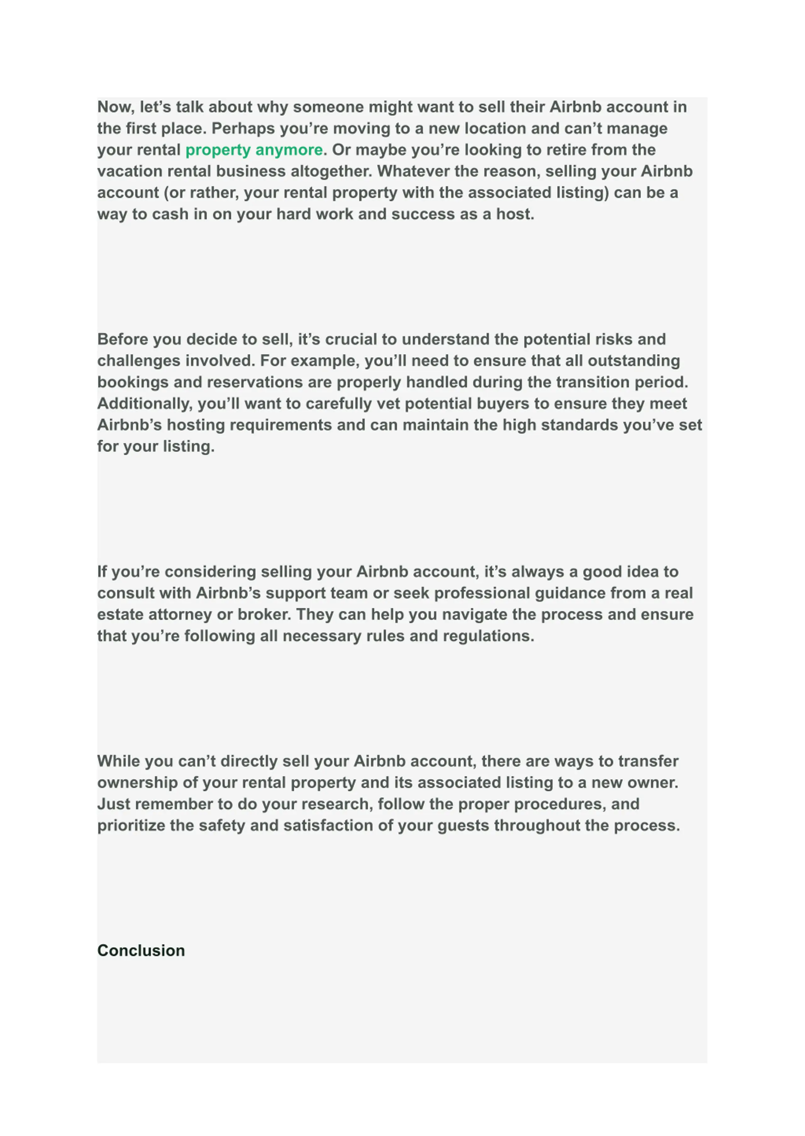 19. Now, lets talk about why someone might want to sell their Airbnb account in the first place. Perhaps you re moving to a new location and can t manage your rental property anymore. Or maybe you re looking to retire from the vacation rental business altogether. Whatever the reason, selling your Airbnb account (or rather, your rental property with the associated listing) can be a way to cash in on your hard work and success as a host. Before you decide to sell, it s crucial to understand the potential risks and challenges involved. For example, you ll need to ensure that all outstanding bookings and reservations are properly handled during the transition period. Additionally, you ll want to carefully vet potential buyers to ensure they meet Airbnb s hosting requirements and can maintain the high standards you ve set for your listing. If you re considering selling your Airbnb account, it s always a good idea to consult with Airbnb s support team or seek professional guidance from a real estate attorney or broker. They can help you navigate the process and ensure that you re following all necessary rules and regulations. While you can t directly sell your Airbnb account, there are ways to transfer ownership of your rental property and its associated listing to a new owner. Just remember to do your research, follow the proper procedures, and prioritize the safety and satisfaction of your guests throughout the process. Conclusion