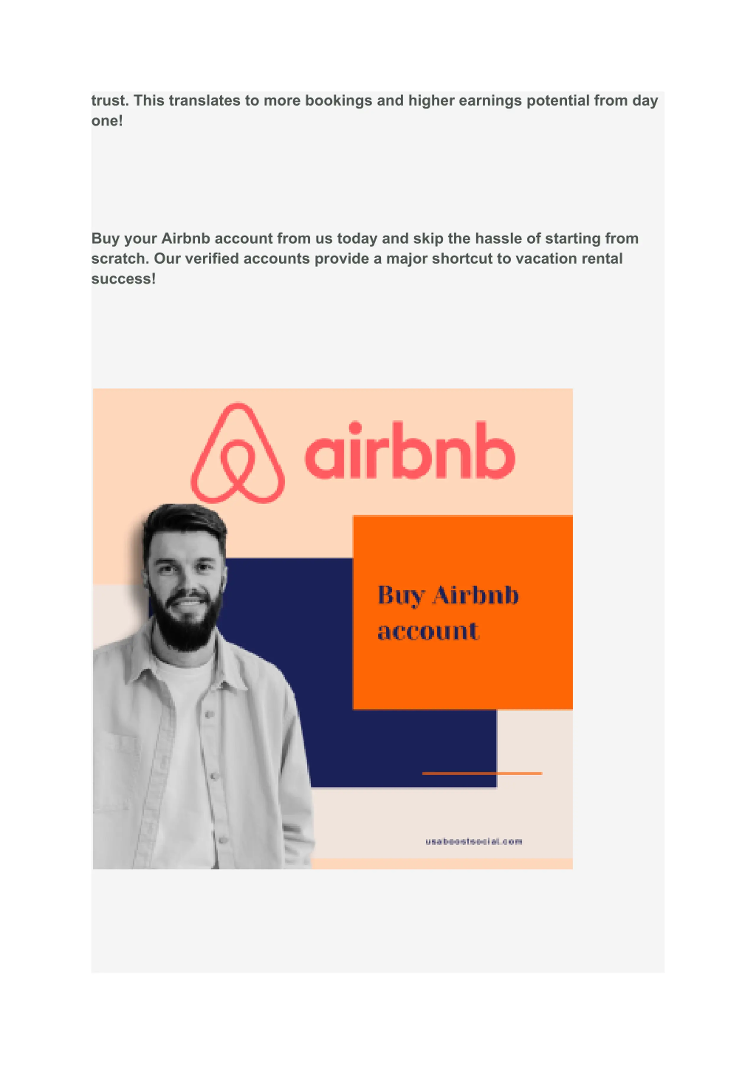 2. Our Services 100% verified Airbnb account Confirmed photo ID Checked email The account is activated and fully verified. We provide 24/7 customer service. Immediate shipping Full document and account verification High-quality service Low price per account Full access granted Airbnb accounts are available in all countries Please contact 24-hour any time Email: usaboostsocial@gmail.com Telegram: @usaboostsocial Skype: usaboostsocial WhatsApp: +1 (929) 630-4484 https://usaboostsocial.com/product/buy-airbnb-accounts/ Buy Airbnb accounts Are you an online entrepreneur? Searching for ways to boost your profits? Then buy Airbnb accounts should be at the top of your agenda! Having multiple Airbnb accounts is a total game-changer in today s competitive vacation rental world. So, why is it so vital to buy Airbnb accounts? First up, it lets you expand your reach and list properties in different areas at the same time. More listings