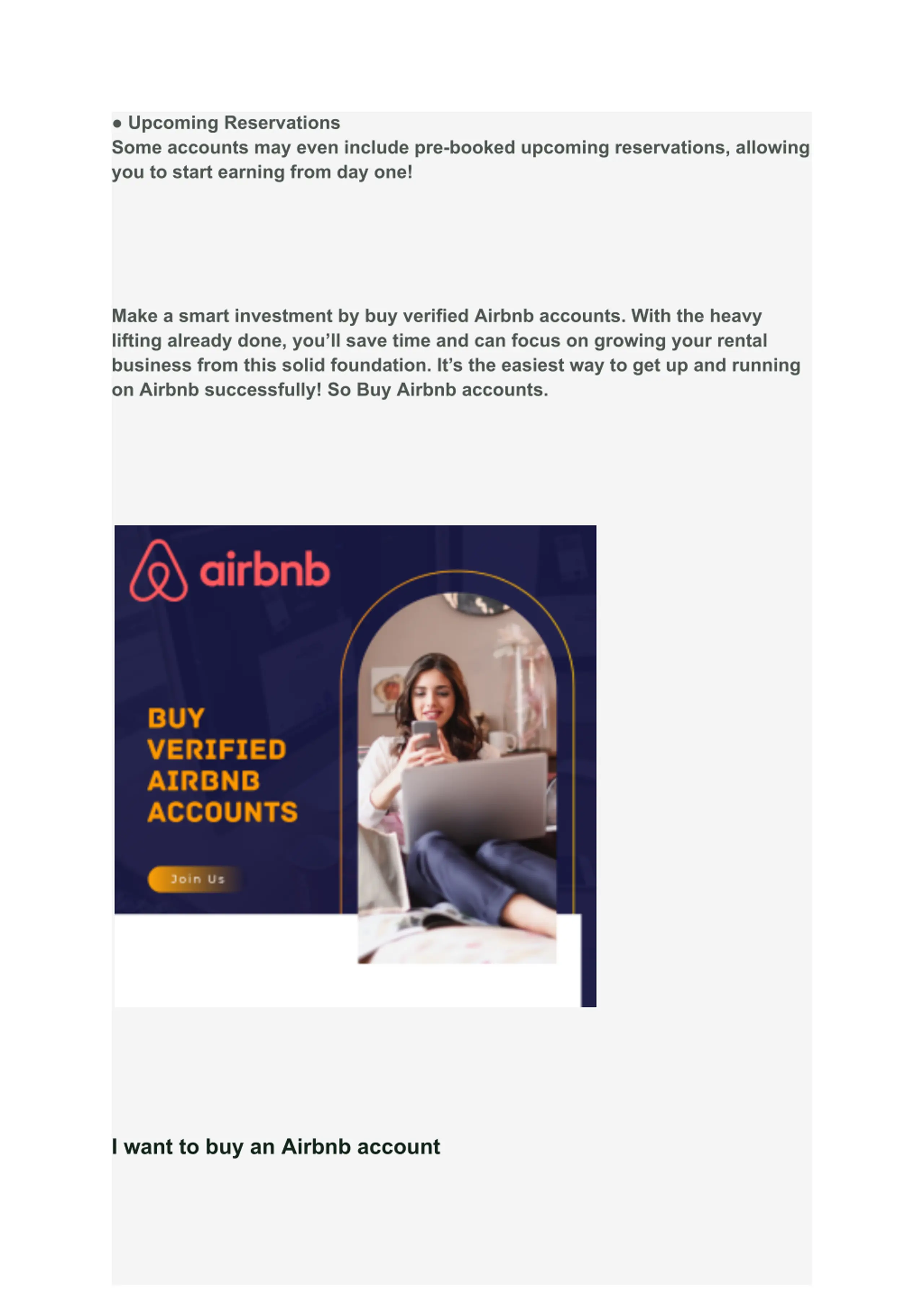 10. Upcoming Reservations Some accounts may even include pre-booked upcoming reservations, allowing you to start earning from day one! Make a smart investment by buy verified Airbnb accounts. With the heavy lifting already done, you ll save time and can focus on growing your rental business from this solid foundation. It s the easiest way to get up and running on Airbnb successfully! So Buy Airbnb accounts. I want to buy an Airbnb account