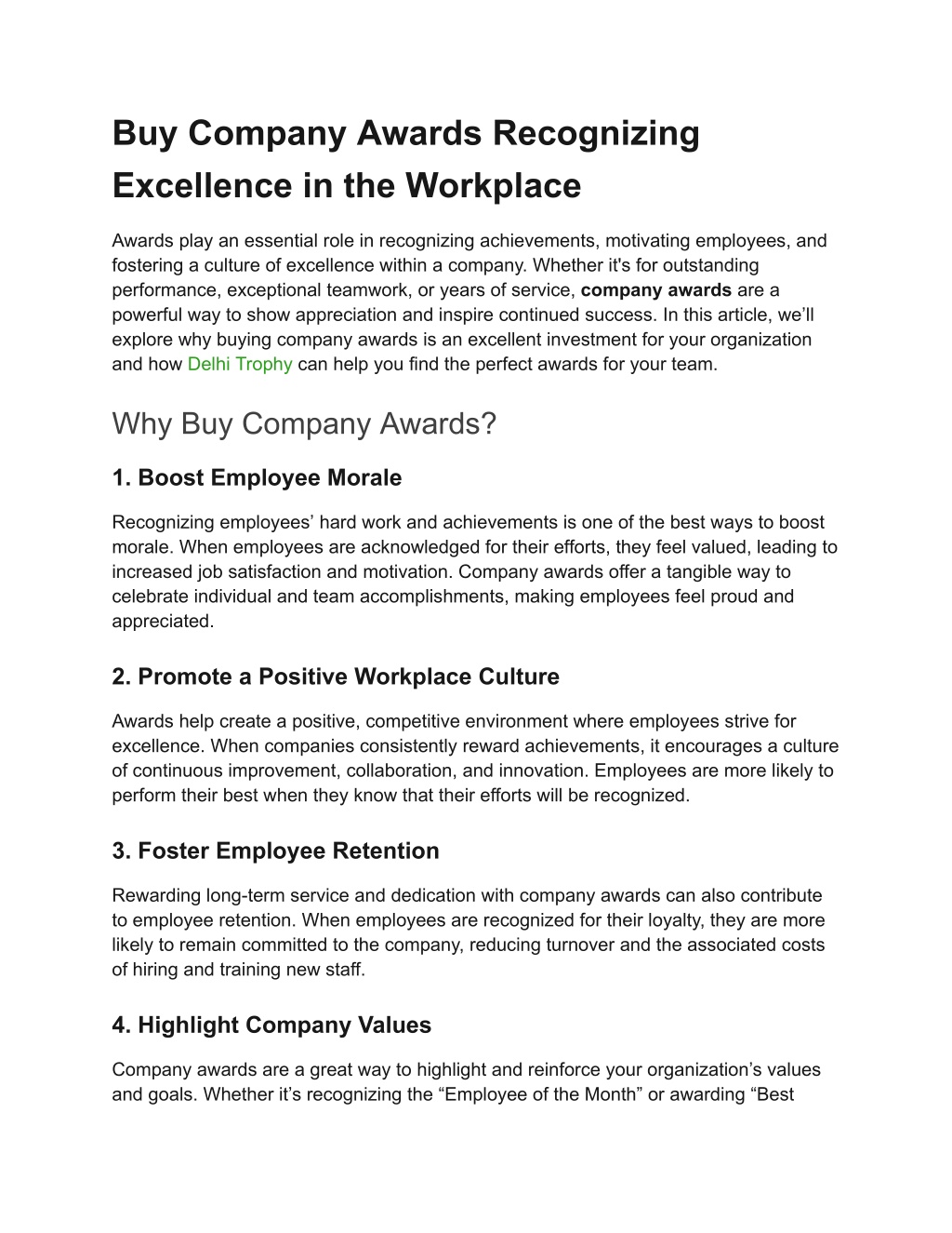 Buy Company Awards Recognizing Excellence in the Workplace Awards play an essential role in recognizing achievements, motivating employees, and fostering a culture of excellence within a company. Whether it's for outstanding performance, exceptional teamwork, or years of service, company awards are a powerful way to show appreciation and inspire continued success. In this article, we ll explore why buying company awards is an excellent investment for your organization and how Delhi Trophy can help you find the perfect awards for your team. Why Buy Company Awards? 1. Boost Employee Morale Recognizing employees hard work and achievements is one of the best ways to boost morale. When employees are acknowledged for their efforts, they feel valued, leading to increased job satisfaction and motivation. Company awards offer a tangible way to celebrate individual and team accomplishments, making employees feel proud and appreciated. 2. Promote a Positive Workplace Culture Awards help create a positive, competitive environment where employees strive for excellence. When companies consistently reward achievements, it encourages a culture of continuous improvement, collaboration, and innovation. Employees are more likely to perform their best when they know that their efforts will be recognized. 3. Foster Employee Retention Rewarding long-term service and dedication with company awards can also contribute to employee retention. When employees are recognized for their loyalty, they are more likely to remain committed to the company, reducing turnover and the associated costs of hiring and training new staff. 4. Highlight Company Values Company awards are a great way to highlight and reinforce your organization s values and goals. Whether it s recognizing the Employee of the Month or awarding Best