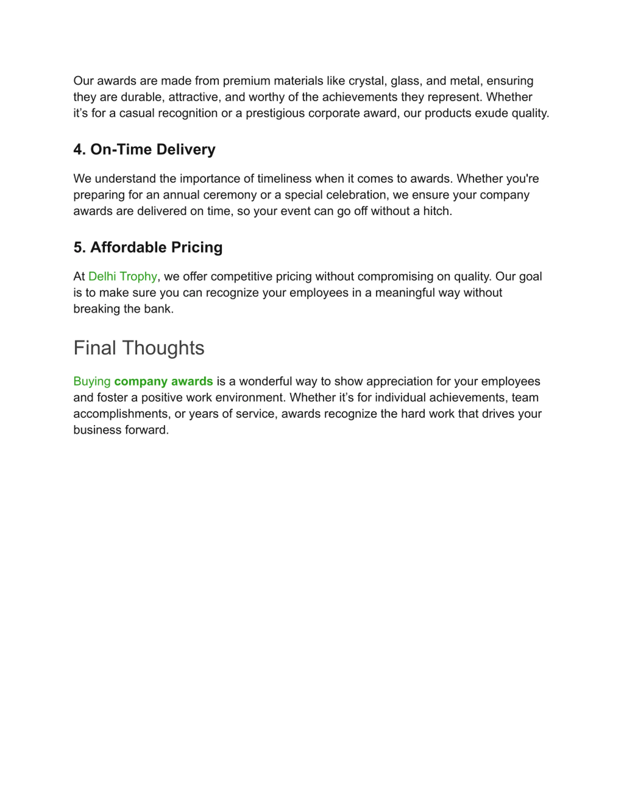 Our awards are made from premium materials like crystal, glass, and metal, ensuring they are durable, attractive, and worthy of the achievements they represent. Whether it s for a casual recognition or a prestigious corporate award, our products exude quality. 4. On-Time Delivery We understand the importance of timeliness when it comes to awards. Whether you're preparing for an annual ceremony or a special celebration, we ensure your company awards are delivered on time, so your event can go off without a hitch. 5. Affordable Pricing At Delhi Trophy, we offer competitive pricing without compromising on quality. Our goal is to make sure you can recognize your employees in a meaningful way without breaking the bank. Final Thoughts Buying company awards is a wonderful way to show appreciation for your employees and foster a positive work environment. Whether it s for individual achievements, team accomplishments, or years of service, awards recognize the hard work that drives your business forward.