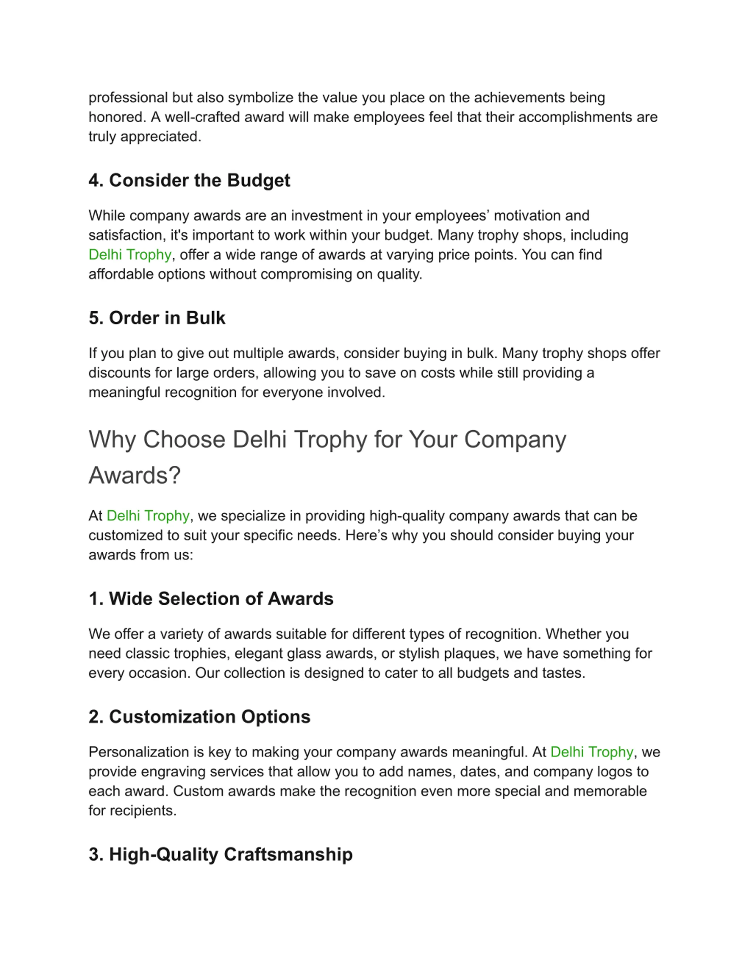 professional but also symbolize the value you place on the achievements being honored. A well-crafted award will make employees feel that their accomplishments are truly appreciated. 4. Consider the Budget While company awards are an investment in your employees motivation and satisfaction, it's important to work within your budget. Many trophy shops, including Delhi Trophy, offer a wide range of awards at varying price points. You can find affordable options without compromising on quality. 5. Order in Bulk If you plan to give out multiple awards, consider buying in bulk. Many trophy shops offer discounts for large orders, allowing you to save on costs while still providing a meaningful recognition for everyone involved. Why Choose Delhi Trophy for Your Company Awards? At Delhi Trophy, we specialize in providing high-quality company awards that can be customized to suit your specific needs. Here s why you should consider buying your awards from us: 1. Wide Selection of Awards We offer a variety of awards suitable for different types of recognition. Whether you need classic trophies, elegant glass awards, or stylish plaques, we have something for every occasion. Our collection is designed to cater to all budgets and tastes. 2. Customization Options Personalization is key to making your company awards meaningful. At Delhi Trophy, we provide engraving services that allow you to add names, dates, and company logos to each award. Custom awards make the recognition even more special and memorable for recipients. 3. High-Quality Craftsmanship