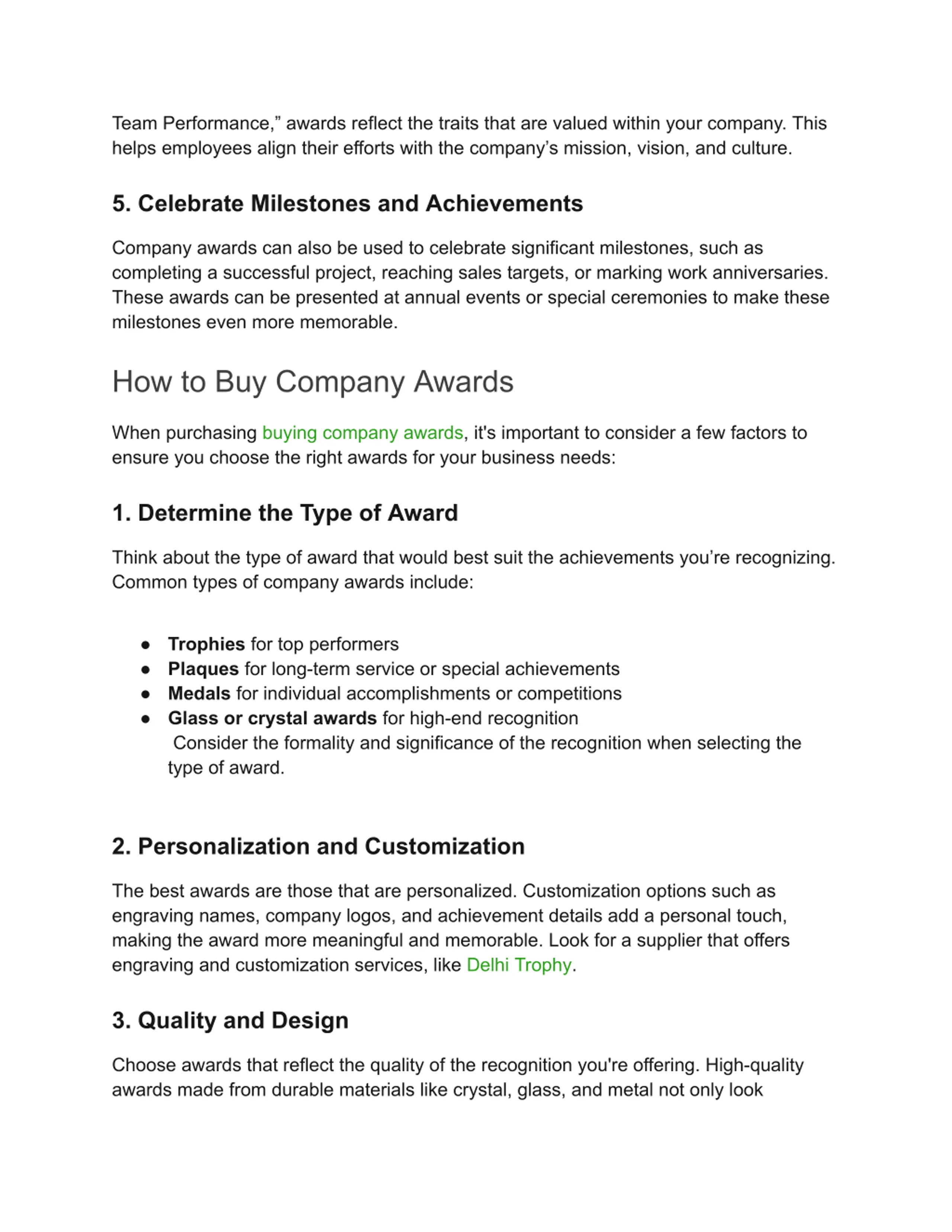 Team Performance, awards reflect the traits that are valued within your company. This helps employees align their efforts with the company s mission, vision, and culture. 5. Celebrate Milestones and Achievements Company awards can also be used to celebrate significant milestones, such as completing a successful project, reaching sales targets, or marking work anniversaries. These awards can be presented at annual events or special ceremonies to make these milestones even more memorable. How to Buy Company Awards When purchasing buying company awards, it's important to consider a few factors to ensure you choose the right awards for your business needs: 1. Determine the Type of Award Think about the type of award that would best suit the achievements you re recognizing. Common types of company awards include: Trophies for top performers Plaques for long-term service or special achievements Medals for individual accomplishments or competitions Glass or crystal awards for high-end recognition Consider the formality and significance of the recognition when selecting the type of award. 2. Personalization and Customization The best awards are those that are personalized. Customization options such as engraving names, company logos, and achievement details add a personal touch, making the award more meaningful and memorable. Look for a supplier that offers engraving and customization services, like Delhi Trophy. 3. Quality and Design Choose awards that reflect the quality of the recognition you're offering. High-quality awards made from durable materials like crystal, glass, and metal not only look