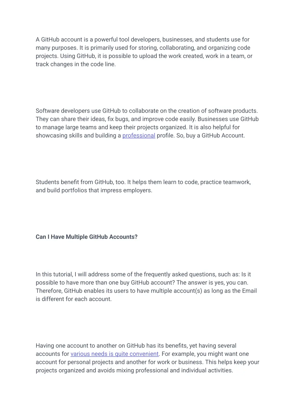A GitHub account is a powerful tool developers, businesses, and students use for many purposes. It is primarily used for storing, collaborating, and organizing code projects. Using GitHub, it is possible to upload the work created, work in a team, or track changes in the code line. Software developers use GitHub to collaborate on the creation of software products. They can share their ideas, fix bugs, and improve code easily. Businesses use GitHub to manage large teams and keep their projects organized. It is also helpful for showcasing skills and building a professional profile. So, buy a GitHub Account. Students benefit from GitHub, too. It helps them learn to code, practice teamwork, and build portfolios that impress employers. Can I Have Multiple GitHub Accounts? In this tutorial, I will address some of the frequently asked questions, such as: Is it possible to have more than one buy GitHub account? The answer is yes, you can. Therefore, GitHub enables its users to have multiple account(s) as long as the Email is different for each account. Having one account to another on GitHub has its benefits, yet having several accounts for various needs is quite convenient. For example, you might want one account for personal projects and another for work or business. This helps keep your projects organized and avoids mixing professional and individual activities.