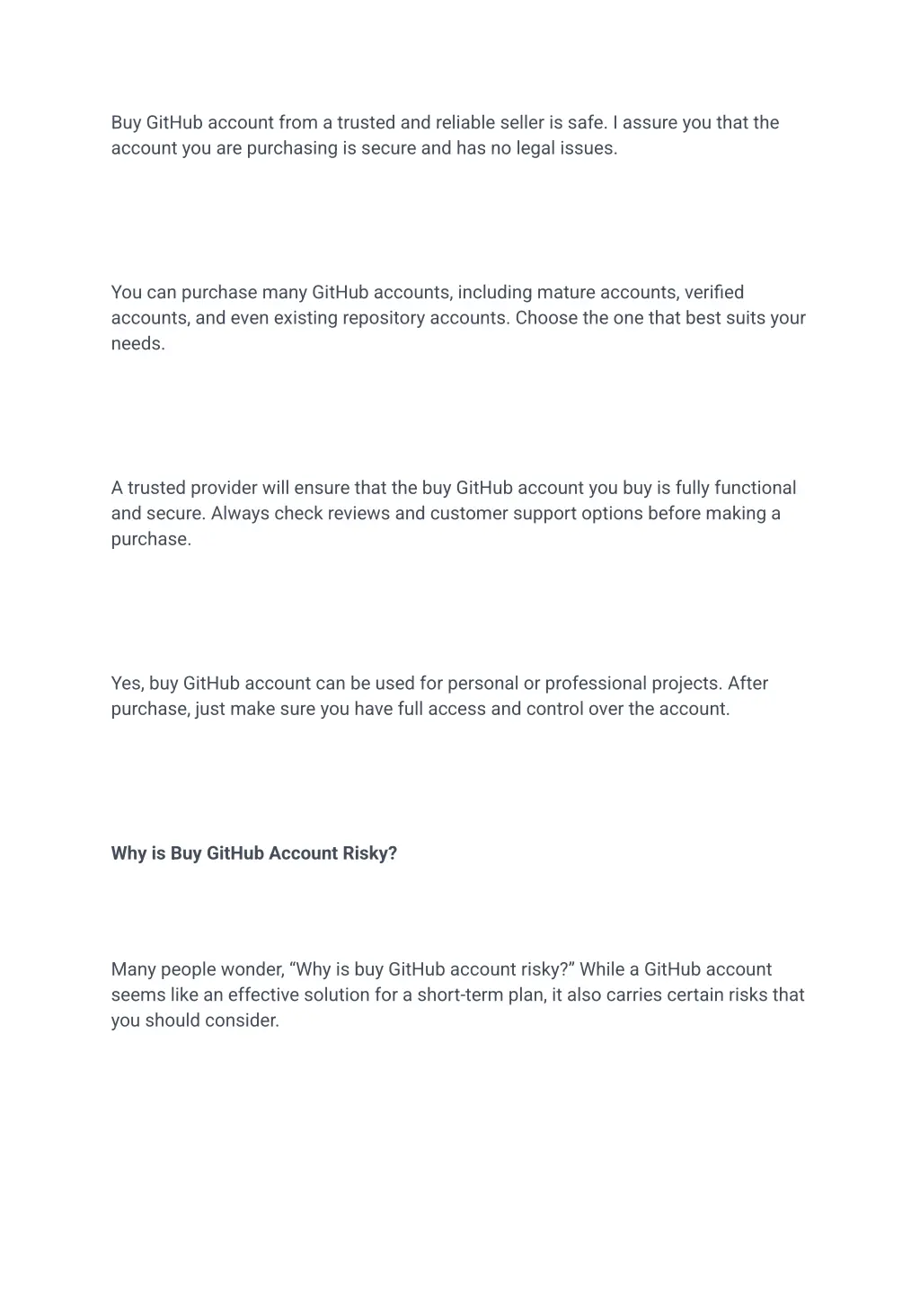 Buy GitHub account from a trusted and reliable seller is safe. I assure you that the account you are purchasing is secure and has no legal issues. You can purchase many GitHub accounts, including mature accounts, verified accounts, and even existing repository accounts. Choose the one that best suits your needs. A trusted provider will ensure that the buy GitHub account you buy is fully functional and secure. Always check reviews and customer support options before making a purchase. Yes, buy GitHub account can be used for personal or professional projects. After purchase, just make sure you have full access and control over the account. Why is Buy GitHub Account Risky? Many people wonder, Why is buy GitHub account risky? While a GitHub account seems like an effective solution for a short-term plan, it also carries certain risks that you should consider.