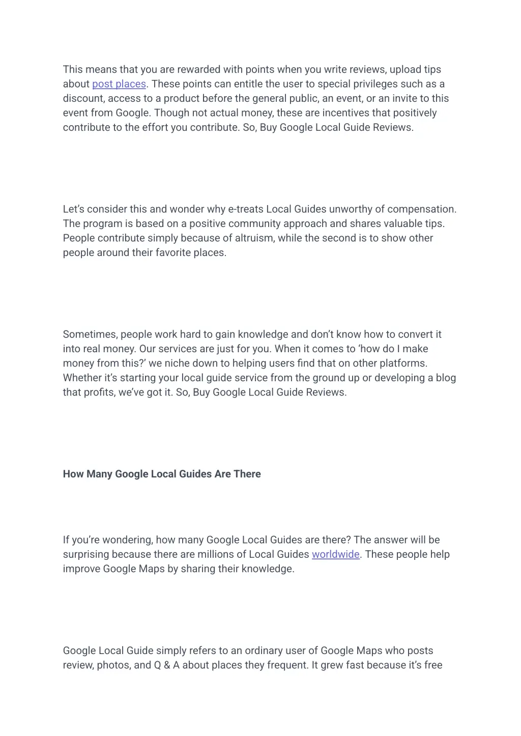 This means that you are rewarded with points when you write reviews, upload tips about post places. These points can entitle the user to special privileges such as a discount, access to a product before the general public, an event, or an invite to this event from Google. Though not actual money, these are incentives that positively contribute to the effort you contribute. So, Buy Google Local Guide Reviews. Let s consider this and wonder why e-treats Local Guides unworthy of compensation. The program is based on a positive community approach and shares valuable tips. People contribute simply because of altruism, while the second is to show other people around their favorite places. Sometimes, people work hard to gain knowledge and don t know how to convert it into real money. Our services are just for you. When it comes to how do I make money from this? we niche down to helping users find that on other platforms. Whether it s starting your local guide service from the ground up or developing a blog that profits, we ve got it. So, Buy Google Local Guide Reviews. How Many Google Local Guides Are There If you re wondering, how many Google Local Guides are there? The answer will be surprising because there are millions of Local Guides worldwide. These people help improve Google Maps by sharing their knowledge. Google Local Guide simply refers to an ordinary user of Google Maps who posts review, photos, and Q & A about places they frequent. It grew fast because it s free