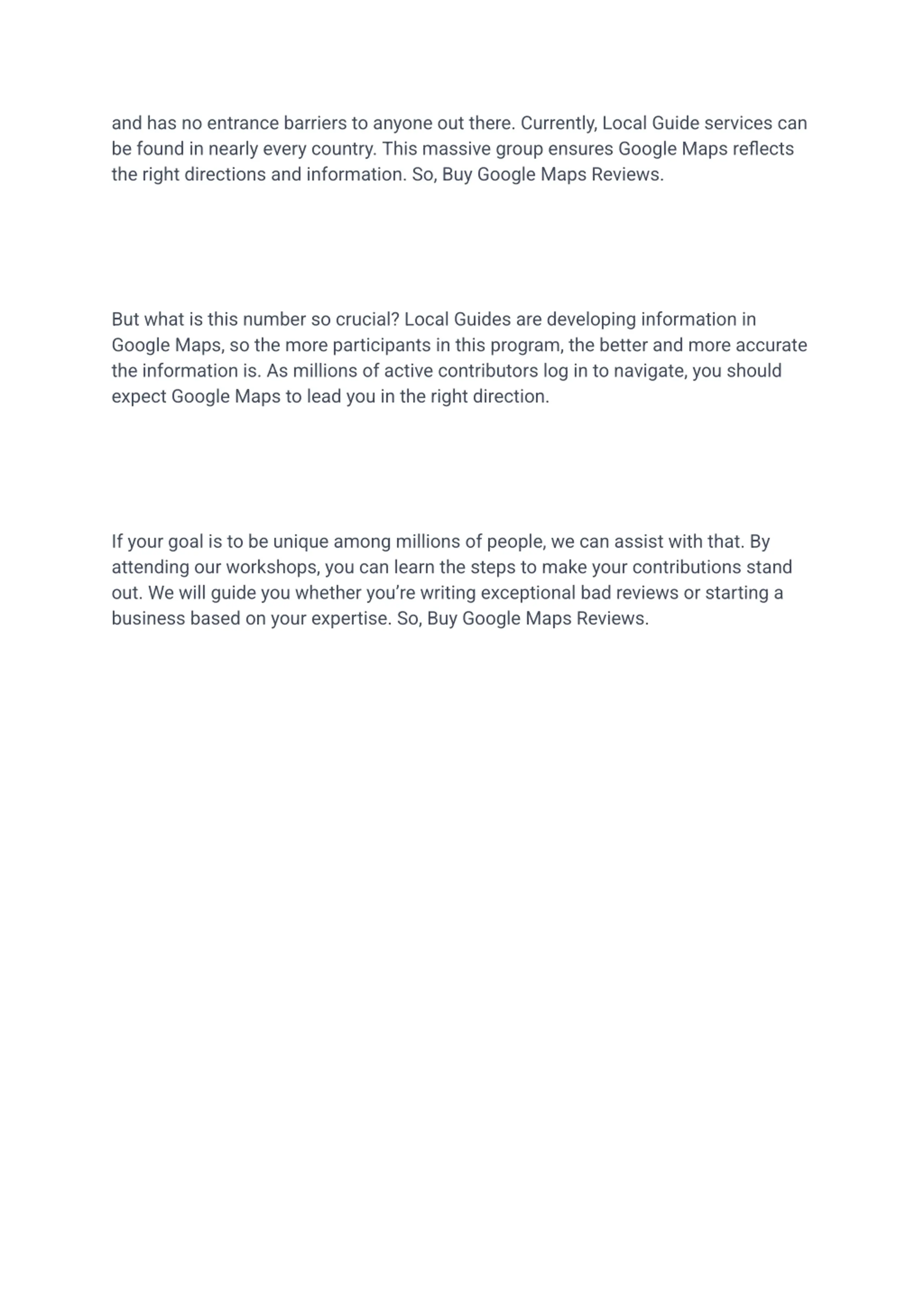 and has no entrance barriers to anyone out there. Currently, Local Guide services can be found in nearly every country. This massive group ensures Google Maps reflects the right directions and information. So, Buy Google Maps Reviews. But what is this number so crucial? Local Guides are developing information in Google Maps, so the more participants in this program, the better and more accurate the information is. As millions of active contributors log in to navigate, you should expect Google Maps to lead you in the right direction. If your goal is to be unique among millions of people, we can assist with that. By attending our workshops, you can learn the steps to make your contributions stand out. We will guide you whether you re writing exceptional bad reviews or starting a business based on your expertise. So, Buy Google Maps Reviews.