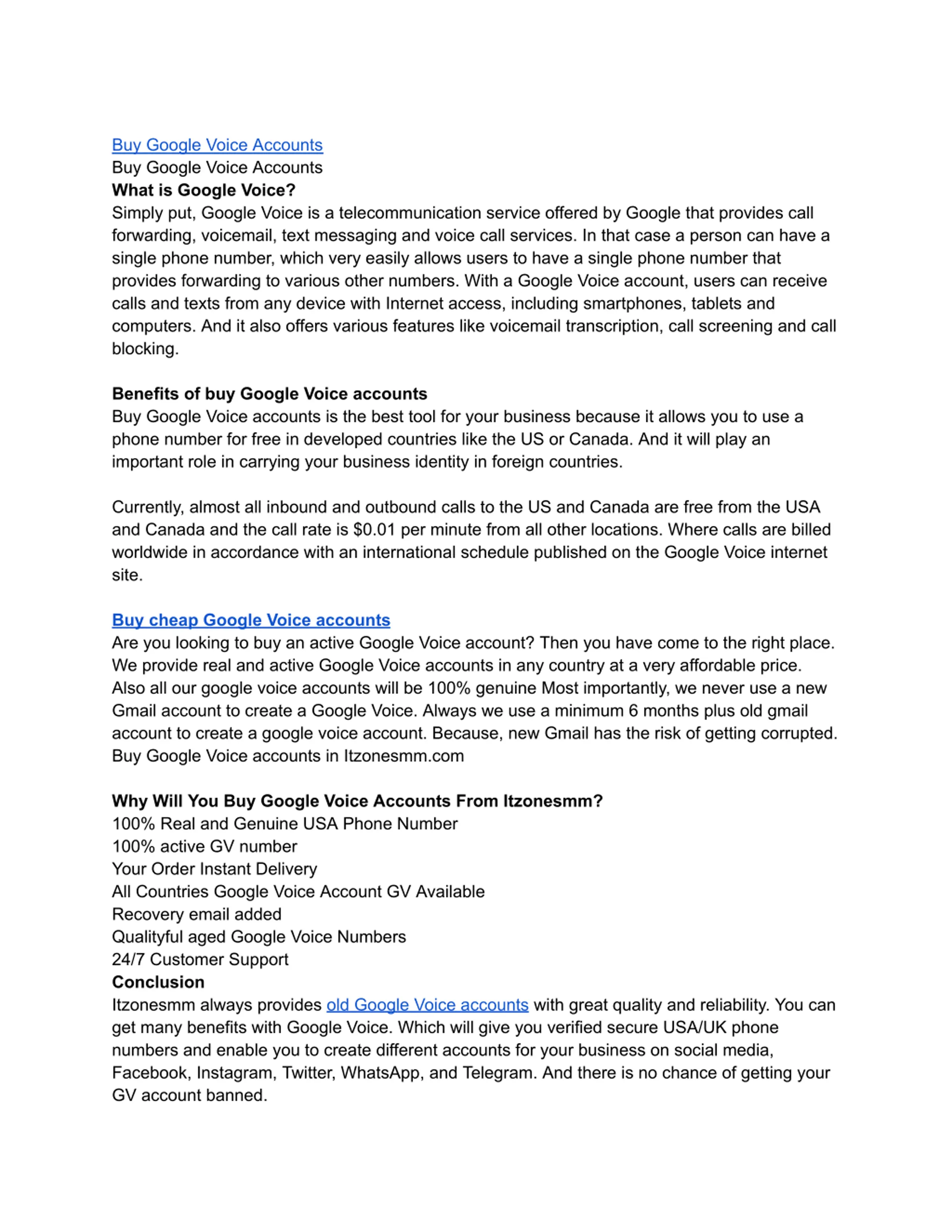 Buy Google Voice Accounts Buy Google Voice Accounts What is Google Voice? Simply put, Google Voice is a telecommunication service offered by Google that provides call forwarding, voicemail, text messaging and voice call services. In that case a person can have a single phone number, which very easily allows users to have a single phone number that provides forwarding to various other numbers. With a Google Voice account, users can receive calls and texts from any device with Internet access, including smartphones, tablets and computers. And it also offers various features like voicemail transcription, call screening and call blocking. Benefits of buy Google Voice accounts Buy Google Voice accounts is the best tool for your business because it allows you to use a phone number for free in developed countries like the US or Canada. And it will play an important role in carrying your business identity in foreign countries. Currently, almost all inbound and outbound calls to the US and Canada are free from the USA and Canada and the call rate is $0.01 per minute from all other locations. Where calls are billed worldwide in accordance with an international schedule published on the Google Voice internet site. Buy cheap Google Voice accounts Are you looking to buy an active Google Voice account? Then you have come to the right place. We provide real and active Google Voice accounts in any country at a very affordable price. Also all our google voice accounts will be 100% genuine Most importantly, we never use a new Gmail account to create a Google Voice. Always we use a minimum 6 months plus old gmail account to create a google voice account. Because, new Gmail has the risk of getting corrupted. Buy Google Voice accounts in Itzonesmm.com Why Will You Buy Google Voice Accounts From Itzonesmm? 100% Real and Genuine USA Phone Number 100% active GV number Your Order Instant Delivery All Countries Google Voice Account GV Available Recovery email added Qualityful aged Google Voice Numbers 24/7 Customer Support Conclusion Itzonesmm always provides old Google Voice accounts with great quality and reliability. You can get many benefits with Google Voice. Which will give you verified secure USA/UK phone numbers and enable you to create different accounts for your business on social media, Facebook, Instagram, Twitter, WhatsApp, and Telegram. And there is no chance of getting your GV account banned.