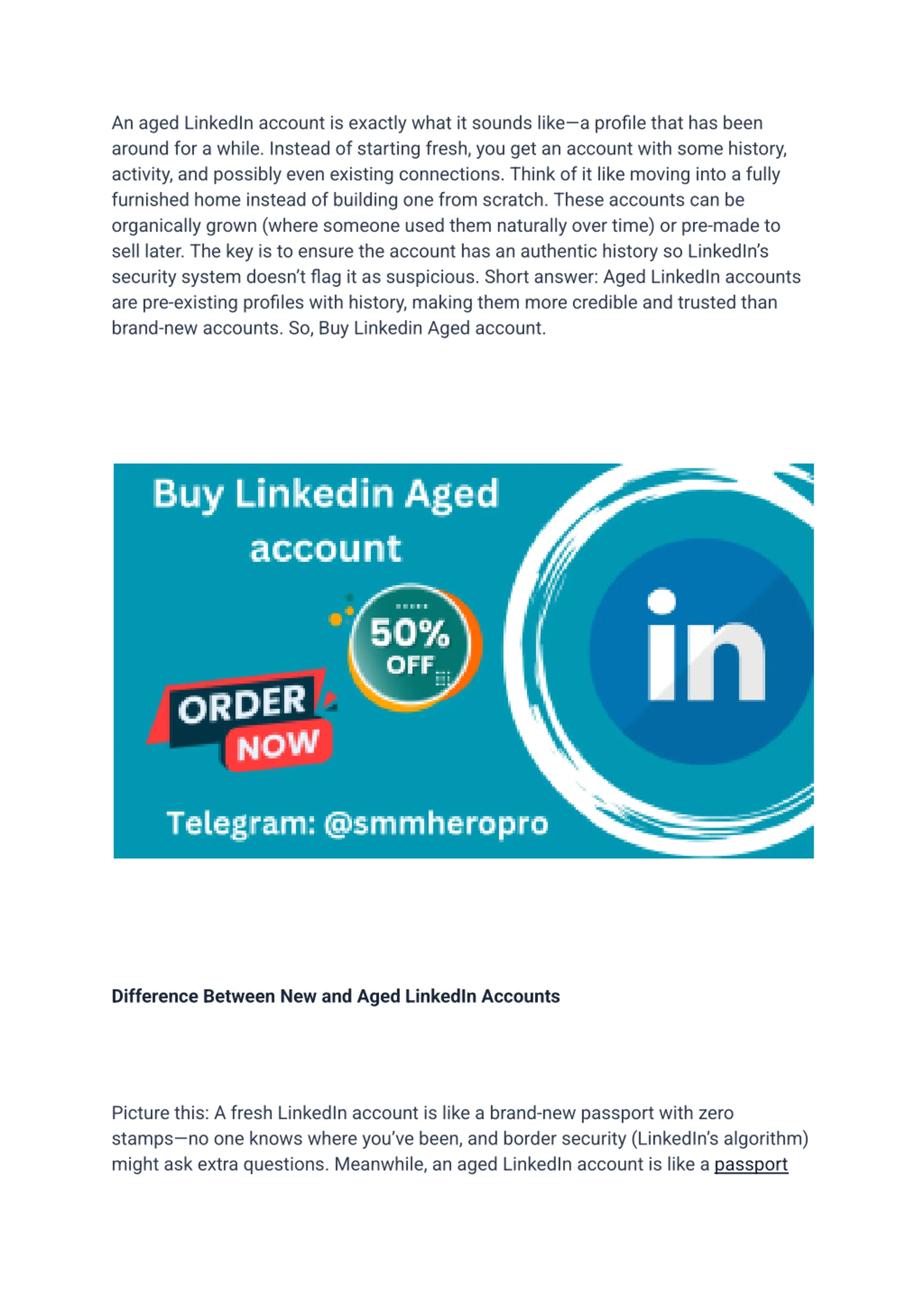 Our Services 100% Customer Satisfaction Guaranteed 100% Non-Loss LinkedIn Account Active LinkedIn Account Very Affordable Price High-Quality Service 100% Money Back Guarantee 24/7 Customer Support Available Bonus for Every Service 100% Fully Verified Account (US, UK, Canada, Australia or Any Other Country) Prepayment Required for Purchasing This Product For more information please get in touch with us Email: smmheropro@gmail.com Telegram: @smmheropro WhatsApp: +1 (765) 354-8002 https://smmheropro.com/product/buy-linkedin-aged-account/ What Are LinkedIn Aged Accounts? If you ve ever tried growing a LinkedIn profile from scratch, you know it can feel like trying to get into an exclusive club where no one knows your name. You send connection requests, but people hesitate to accept. Your posts barely get any engagement. And LinkedIn s security measures? They can sometimes make things even trickier. That s where aged LinkedIn accounts come into play they help you skip the awkward newbie phase and jump straight into credibility and trust. Definition of Aged LinkedIn Accounts