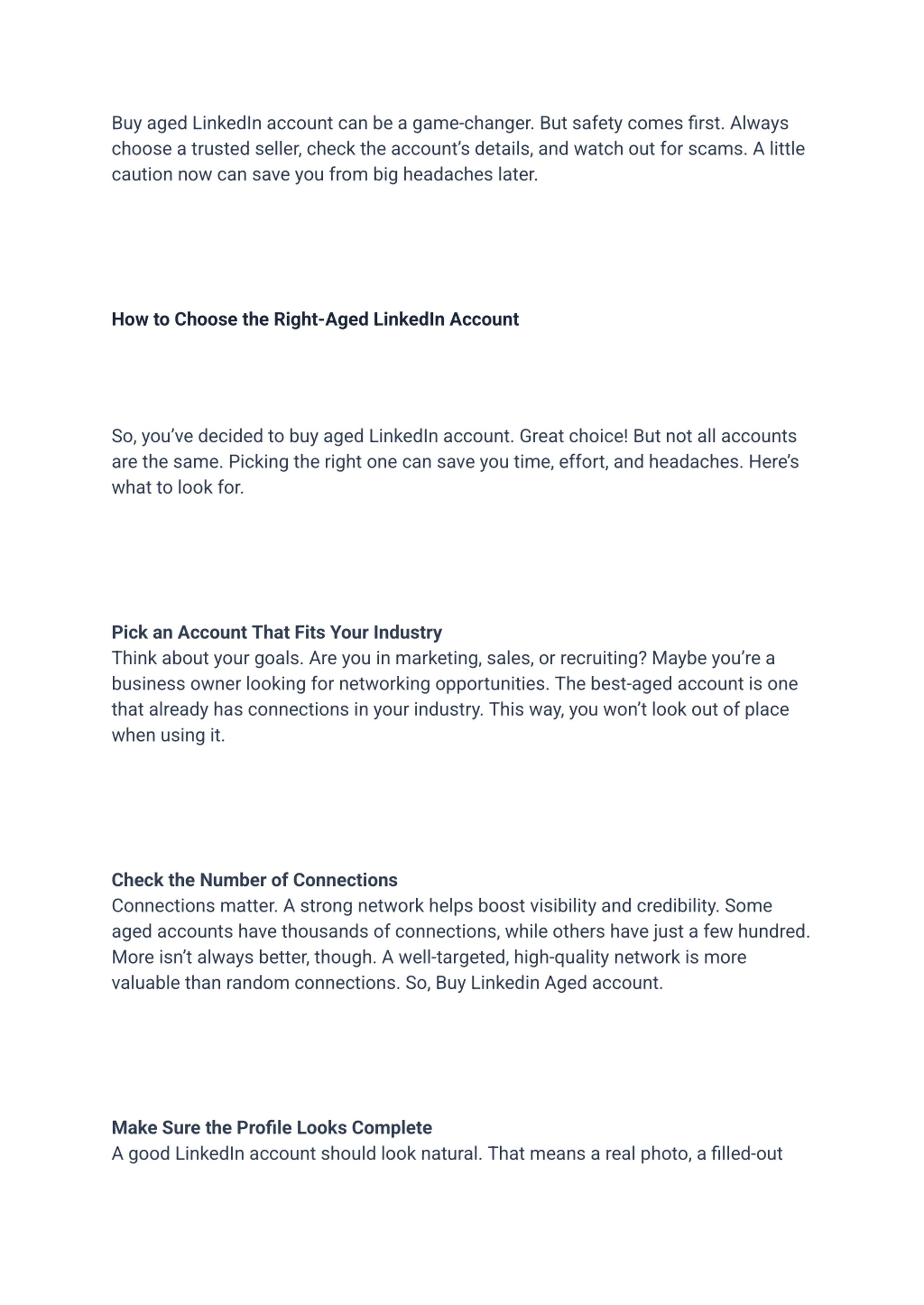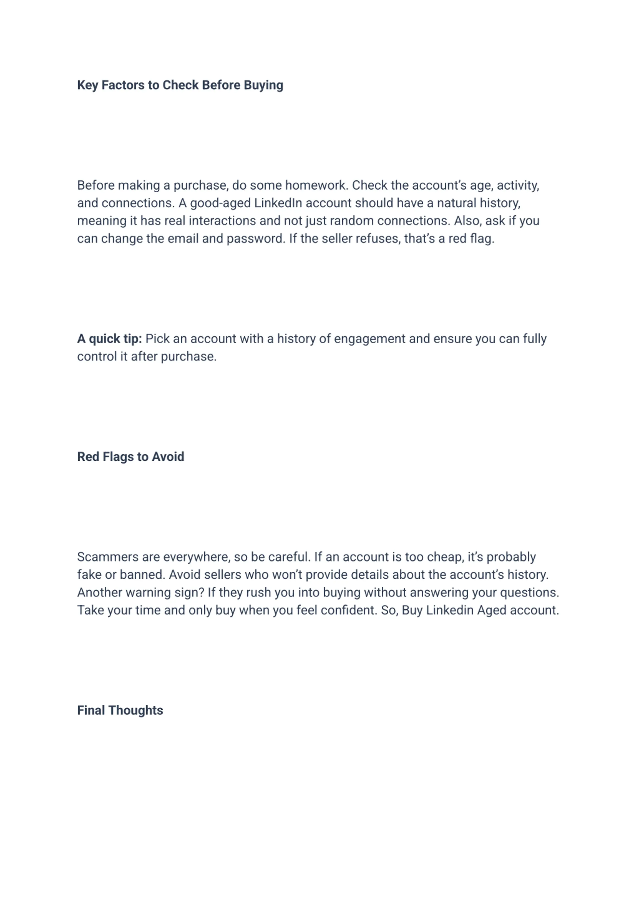 Key Factors to Check Before Buying Before making a purchase, do some homework. Check the account s age, activity, and connections. A good-aged LinkedIn account should have a natural history, meaning it has real interactions and not just random connections. Also, ask if you can change the email and password. If the seller refuses, that s a red flag. A quick tip: Pick an account with a history of engagement and ensure you can fully control it after purchase. Red Flags to Avoid Scammers are everywhere, so be careful. If an account is too cheap, it s probably fake or banned. Avoid sellers who won t provide details about the account s history. Another warning sign? If they rush you into buying without answering your questions. Take your time and only buy when you feel confident. So, Buy Linkedin Aged account. Final Thoughts