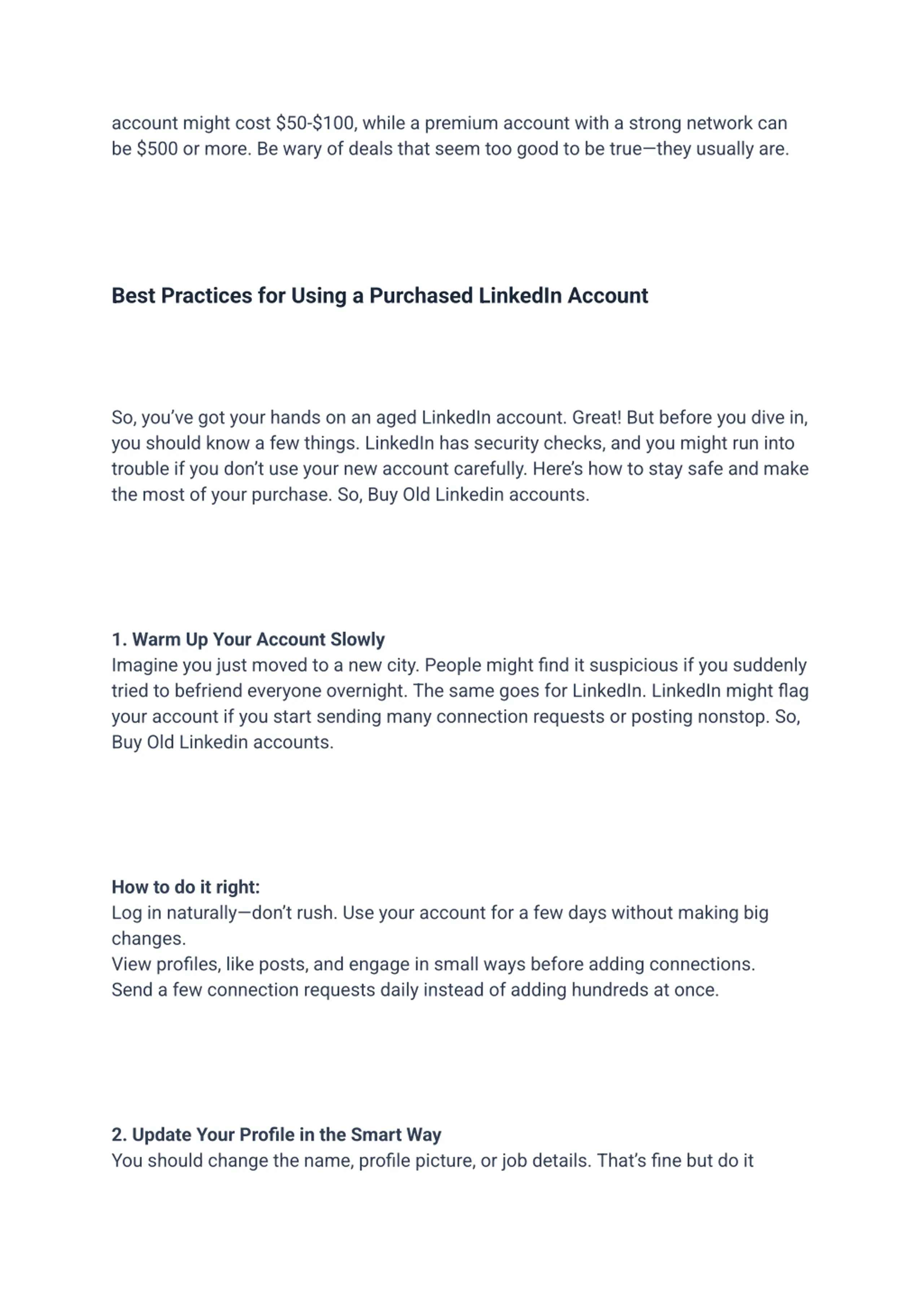 account might cost $50-$100, while a premium account with a strong network can be $500 or more. Be wary of deals that seem too good to be true they usually are. Best Practices for Using a Purchased LinkedIn Account So, you ve got your hands on an aged LinkedIn account. Great! But before you dive in, you should know a few things. LinkedIn has security checks, and you might run into trouble if you don t use your new account carefully. Here s how to stay safe and make the most of your purchase. So, Buy Old Linkedin accounts. 1. Warm Up Your Account Slowly Imagine you just moved to a new city. People might find it suspicious if you suddenly tried to befriend everyone overnight. The same goes for LinkedIn. LinkedIn might flag your account if you start sending many connection requests or posting nonstop. So, Buy Old Linkedin accounts. How to do it right: Log in naturally don t rush. Use your account for a few days without making big changes. View profiles, like posts, and engage in small ways before adding connections. Send a few connection requests daily instead of adding hundreds at once. 2. Update Your Profile in the Smart Way You should change the name, profile picture, or job details. That s fine but do it