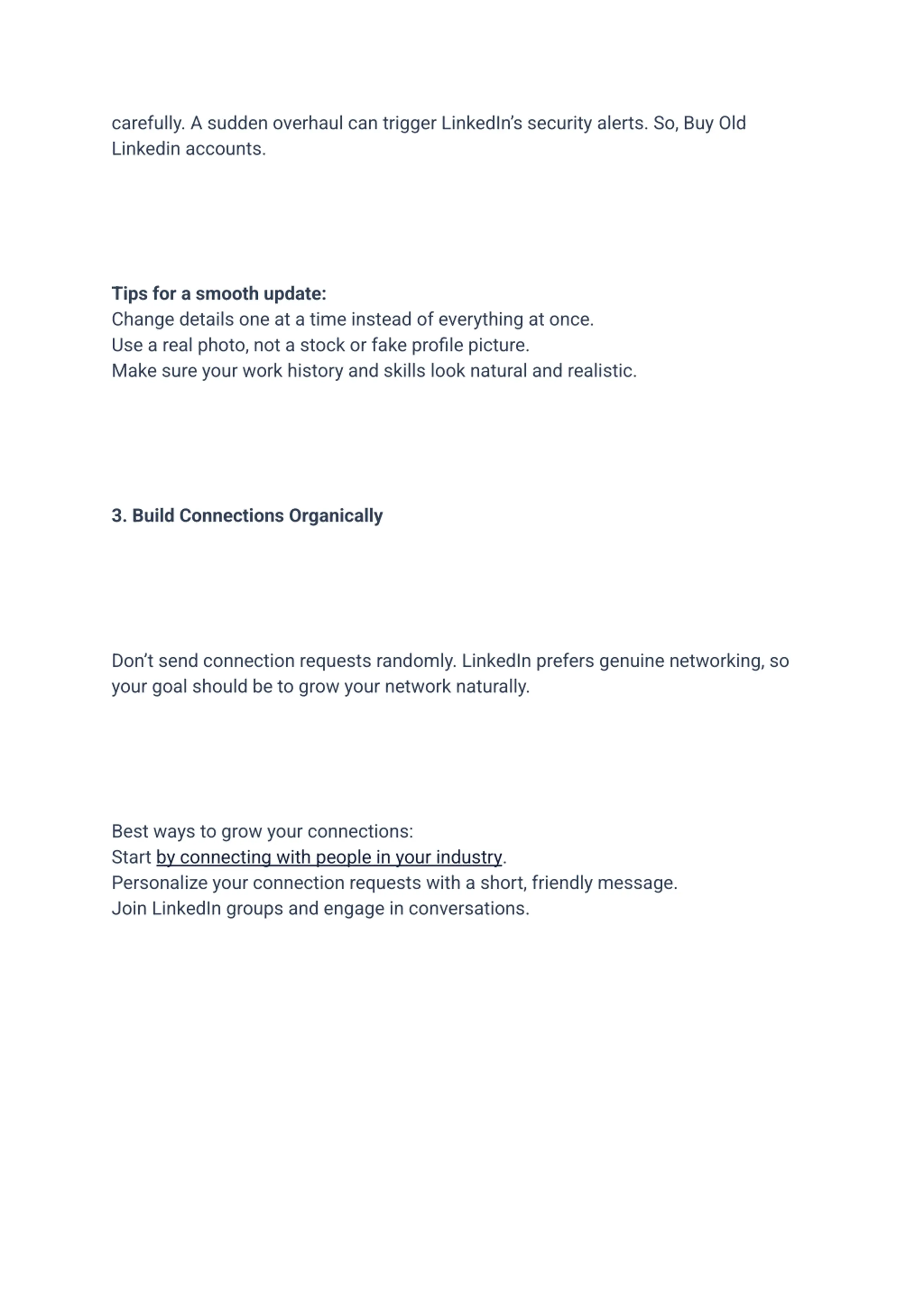 carefully. A sudden overhaul can trigger LinkedIns security alerts. So, Buy Old Linkedin accounts. Tips for a smooth update: Change details one at a time instead of everything at once. Use a real photo, not a stock or fake profile picture. Make sure your work history and skills look natural and realistic. 3. Build Connections Organically Don t send connection requests randomly. LinkedIn prefers genuine networking, so your goal should be to grow your network naturally. Best ways to grow your connections: Start by connecting with people in your industry. Personalize your connection requests with a short, friendly message. Join LinkedIn groups and engage in conversations.