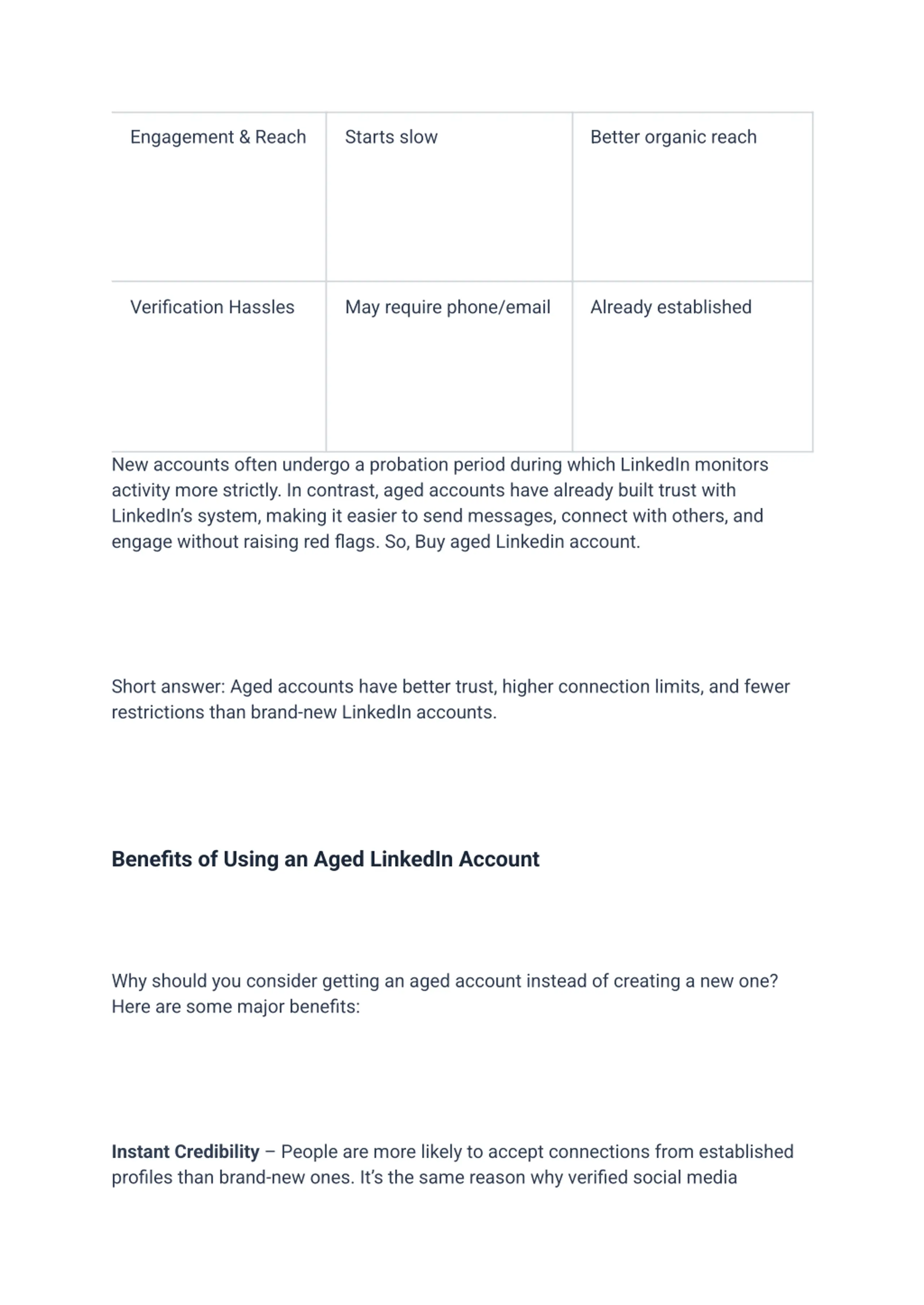 Engagement & Reach Starts slow Better organic reach Verification Hassles May require phone/email Already established New accounts often undergo a probation period during which LinkedIn monitors activity more strictly. In contrast, aged accounts have already built trust with LinkedIn s system, making it easier to send messages, connect with others, and engage without raising red flags. So, Buy aged Linkedin account. Short answer: Aged accounts have better trust, higher connection limits, and fewer restrictions than brand-new LinkedIn accounts. Benefits of Using an Aged LinkedIn Account Why should you consider getting an aged account instead of creating a new one? Here are some major benefits: Instant Credibility People are more likely to accept connections from established profiles than brand-new ones. It s the same reason why verified social media