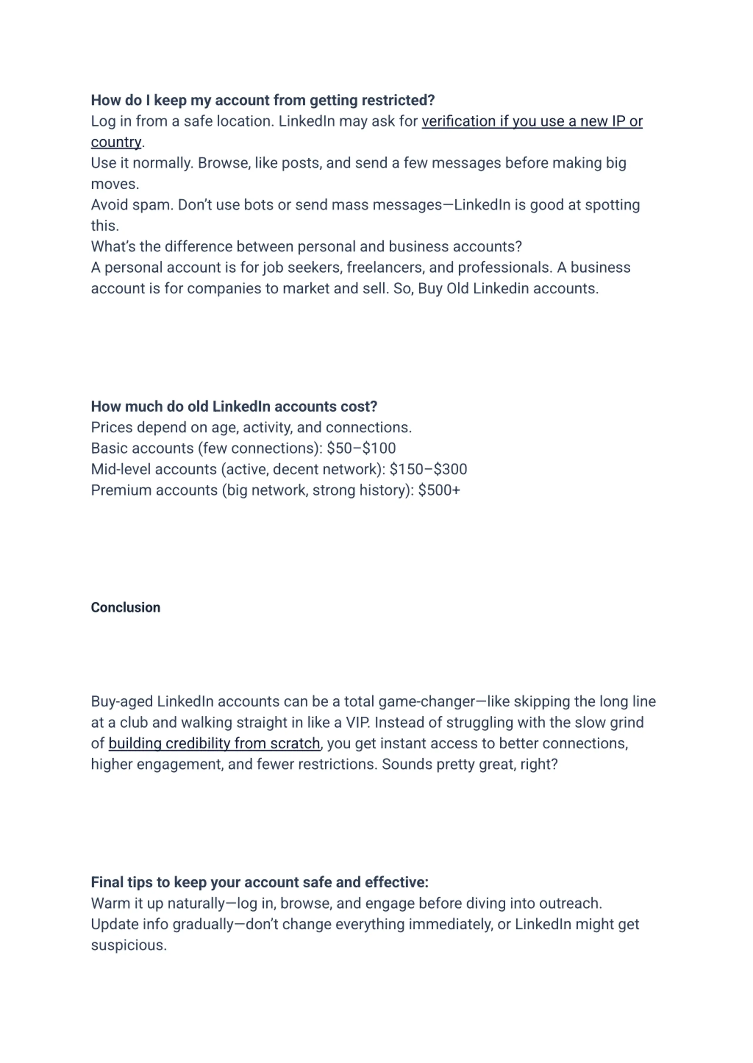 How do I keep my account from getting restricted? Log in from a safe location. LinkedIn may ask for verification if you use a new IP or country. Use it normally. Browse, like posts, and send a few messages before making big moves. Avoid spam. Don t use bots or send mass messages LinkedIn is good at spotting this. What s the difference between personal and business accounts? A personal account is for job seekers, freelancers, and professionals. A business account is for companies to market and sell. So, Buy Old Linkedin accounts. How much do old LinkedIn accounts cost? Prices depend on age, activity, and connections. Basic accounts (few connections): $50 $100 Mid-level accounts (active, decent network): $150 $300 Premium accounts (big network, strong history): $500+ Conclusion Buy-aged LinkedIn accounts can be a total game-changer like skipping the long line at a club and walking straight in like a VIP. Instead of struggling with the slow grind of building credibility from scratch, you get instant access to better connections, higher engagement, and fewer restrictions. Sounds pretty great, right? Final tips to keep your account safe and effective: Warm it up naturally log in, browse, and engage before diving into outreach. Update info gradually don t change everything immediately, or LinkedIn might get suspicious.