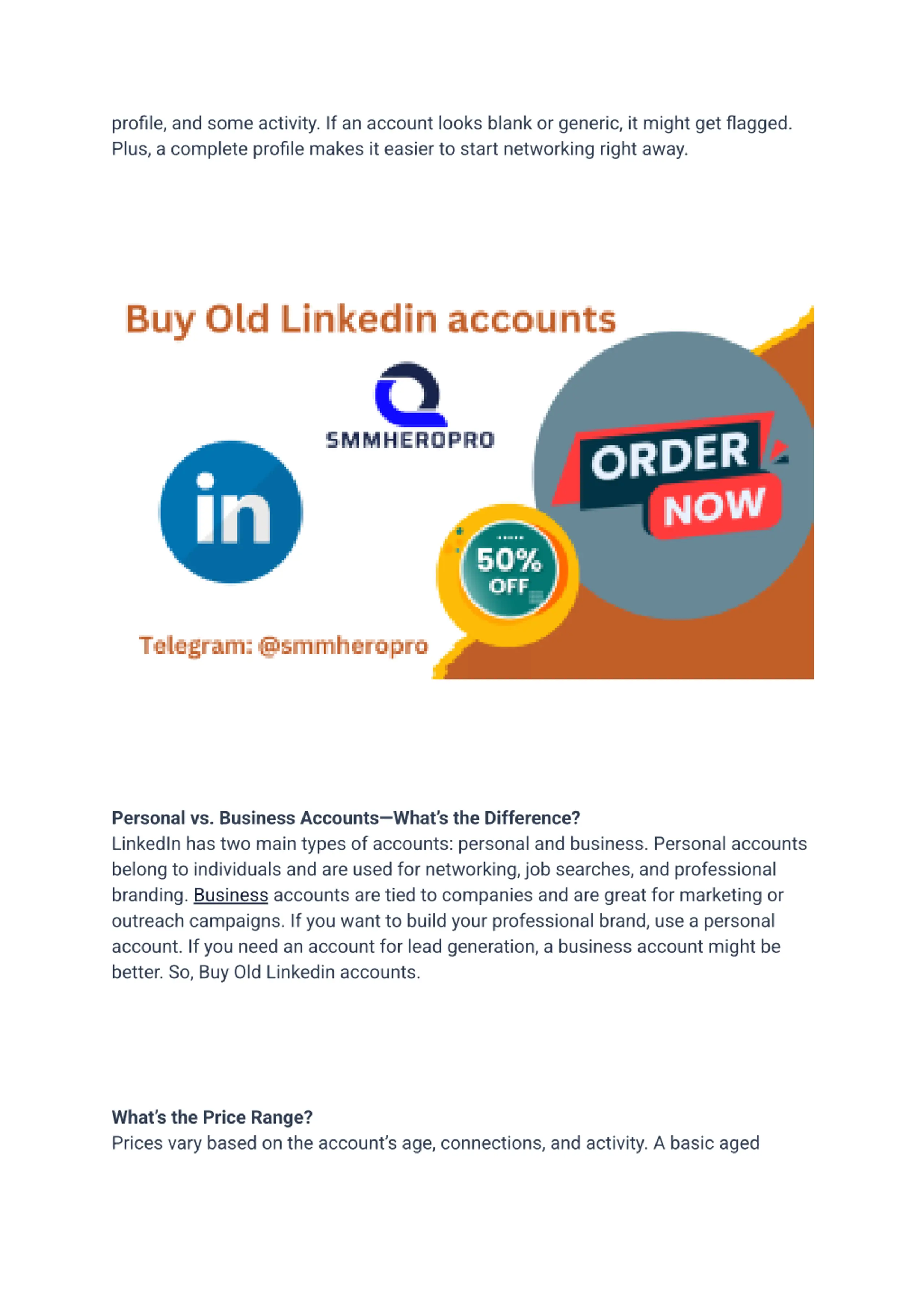 profile, and some activity. If an account looks blank or generic, it might get flagged. Plus, a complete profile makes it easier to start networking right away. Personal vs. Business Accounts What s the Difference? LinkedIn has two main types of accounts: personal and business. Personal accounts belong to individuals and are used for networking, job searches, and professional branding. Business accounts are tied to companies and are great for marketing or outreach campaigns. If you want to build your professional brand, use a personal account. If you need an account for lead generation, a business account might be better. So, Buy Old Linkedin accounts. What s the Price Range? Prices vary based on the account s age, connections, and activity. A basic aged