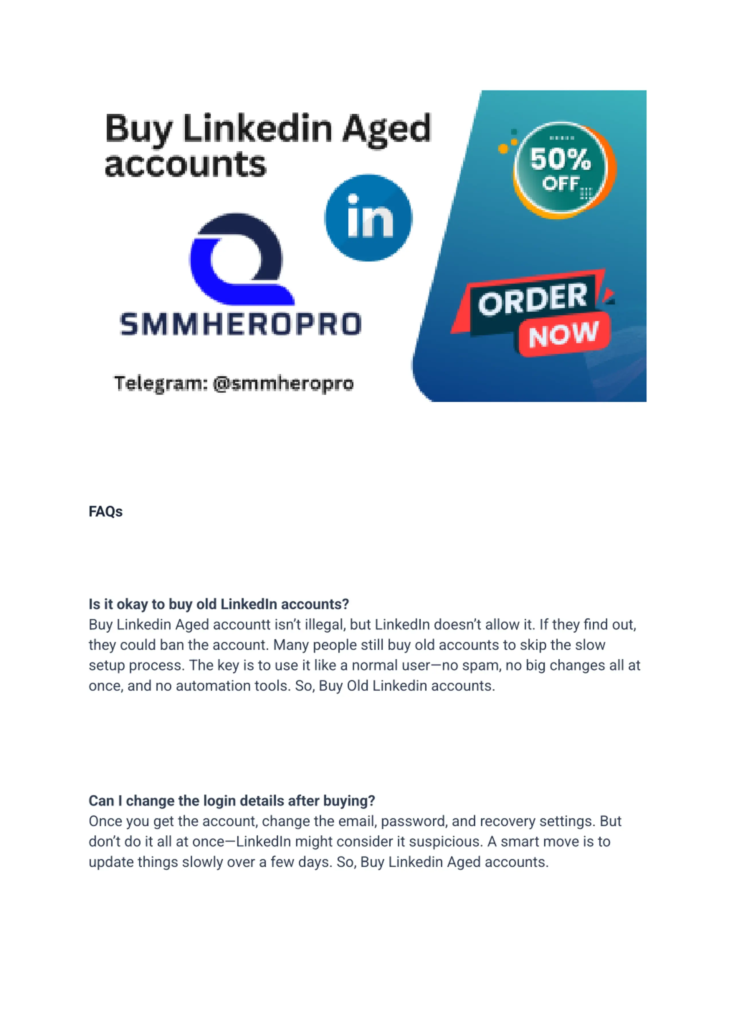 Our Services 100% Customer Satisfaction Guaranteed 100% Non-Loss LinkedIn Account Active LinkedIn Account Very Affordable Price High-Quality Service 100% Money Back Guarantee 24/7 Customer Support Available Bonus for Every Service 100% Fully Verified Account (US, UK, Canada, Australia or Any Other Country) Prepayment Required for Purchasing This Product For more information please get in touch with us Email: smmheropro@gmail.com Telegram: @smmheropro WhatsApp: +1 (765) 354-8002 https://smmheropro.com/product/buy-linkedin-aged-account/ What Are LinkedIn Aged Accounts? If you ve ever tried growing a LinkedIn profile from scratch, you know it can feel like trying to get into an exclusive club where no one knows your name. You send connection requests, but people hesitate to accept. Your posts barely get any engagement. And LinkedIn s security measures? They can sometimes make things even trickier. That s where aged LinkedIn accounts come into play they help you skip the awkward newbie phase and jump straight into credibility and trust. Definition of Aged LinkedIn Accounts