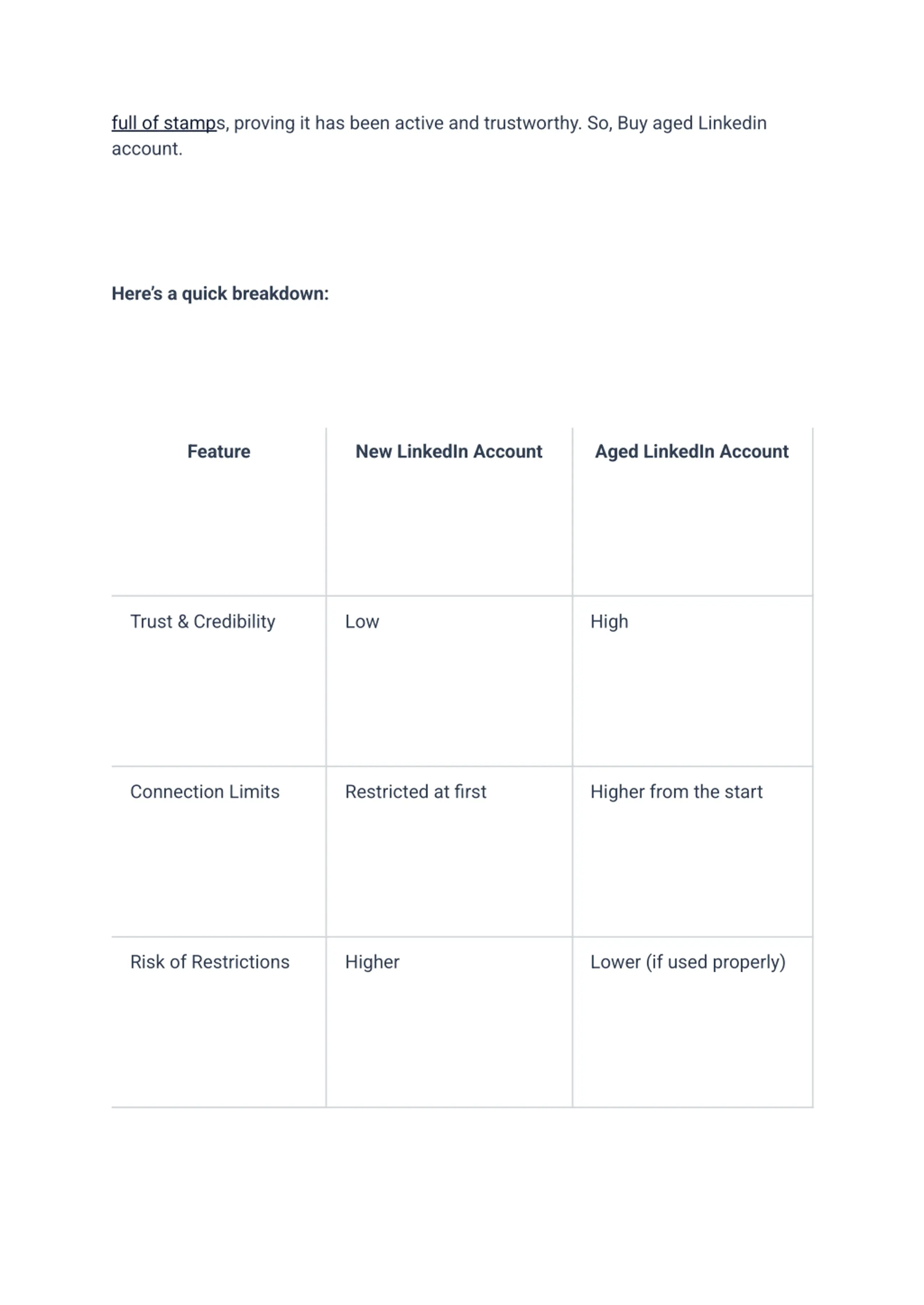 full of stamps, proving it has been active and trustworthy. So, Buy aged Linkedin account. Here s a quick breakdown: Feature New LinkedIn Account Aged LinkedIn Account Trust & Credibility Low High Connection Limits Restricted at first Higher from the start Risk of Restrictions Higher Lower (if used properly)