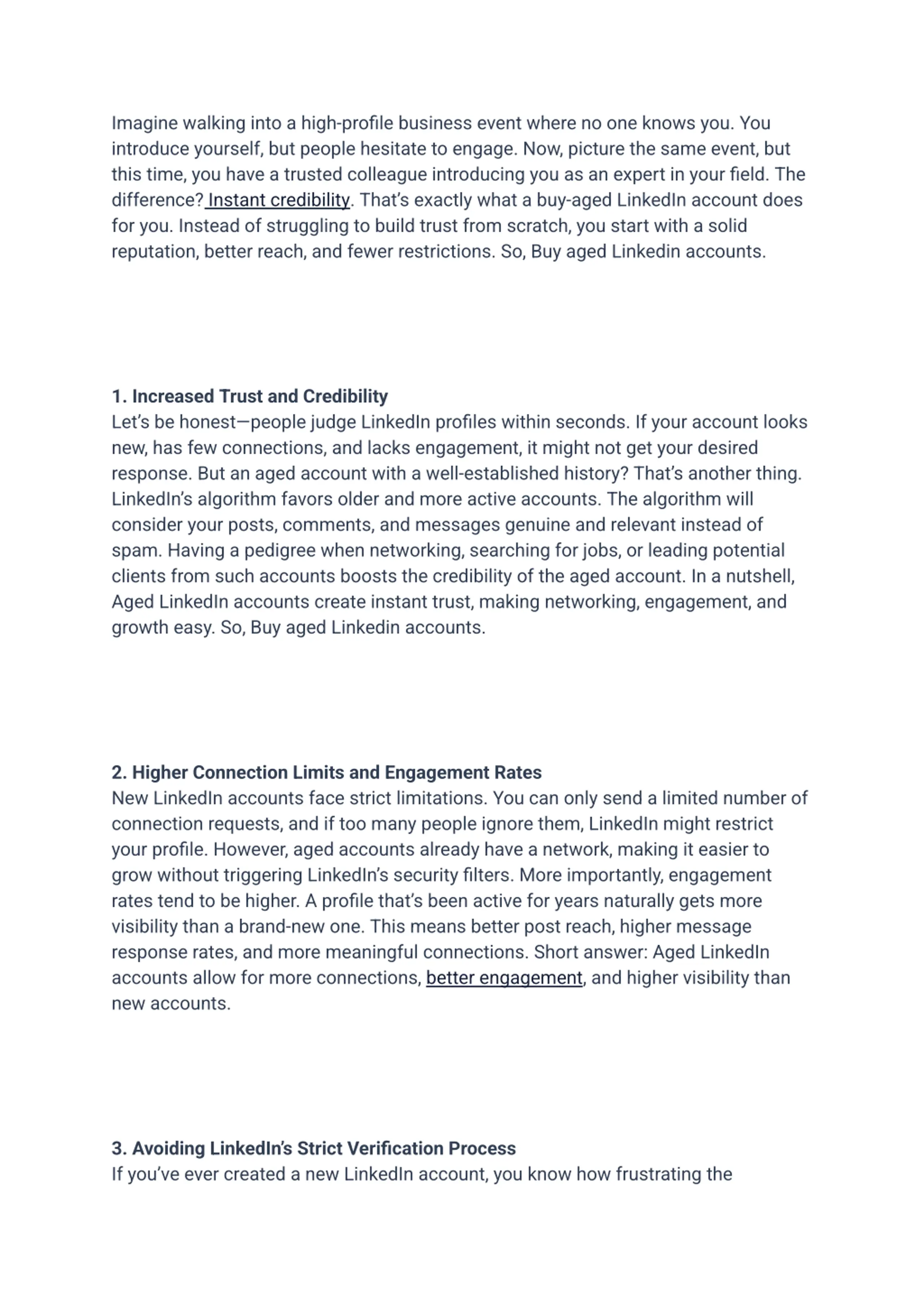 Imagine walking into a high-profile business event where no one knows you. You introduce yourself, but people hesitate to engage. Now, picture the same event, but this time, you have a trusted colleague introducing you as an expert in your field. The difference? Instant credibility. That s exactly what a buy-aged LinkedIn account does for you. Instead of struggling to build trust from scratch, you start with a solid reputation, better reach, and fewer restrictions. So, Buy aged Linkedin accounts. 1. Increased Trust and Credibility Let s be honest people judge LinkedIn profiles within seconds. If your account looks new, has few connections, and lacks engagement, it might not get your desired response. But an aged account with a well-established history? That s another thing. LinkedIn s algorithm favors older and more active accounts. The algorithm will consider your posts, comments, and messages genuine and relevant instead of spam. Having a pedigree when networking, searching for jobs, or leading potential clients from such accounts boosts the credibility of the aged account. In a nutshell, Aged LinkedIn accounts create instant trust, making networking, engagement, and growth easy. So, Buy aged Linkedin accounts. 2. Higher Connection Limits and Engagement Rates New LinkedIn accounts face strict limitations. You can only send a limited number of connection requests, and if too many people ignore them, LinkedIn might restrict your profile. However, aged accounts already have a network, making it easier to grow without triggering LinkedIn s security filters. More importantly, engagement rates tend to be higher. A profile that s been active for years naturally gets more visibility than a brand-new one. This means better post reach, higher message response rates, and more meaningful connections. Short answer: Aged LinkedIn accounts allow for more connections, better engagement, and higher visibility than new accounts. 3. Avoiding LinkedIn s Strict Verification Process If you ve ever created a new LinkedIn account, you know how frustrating the