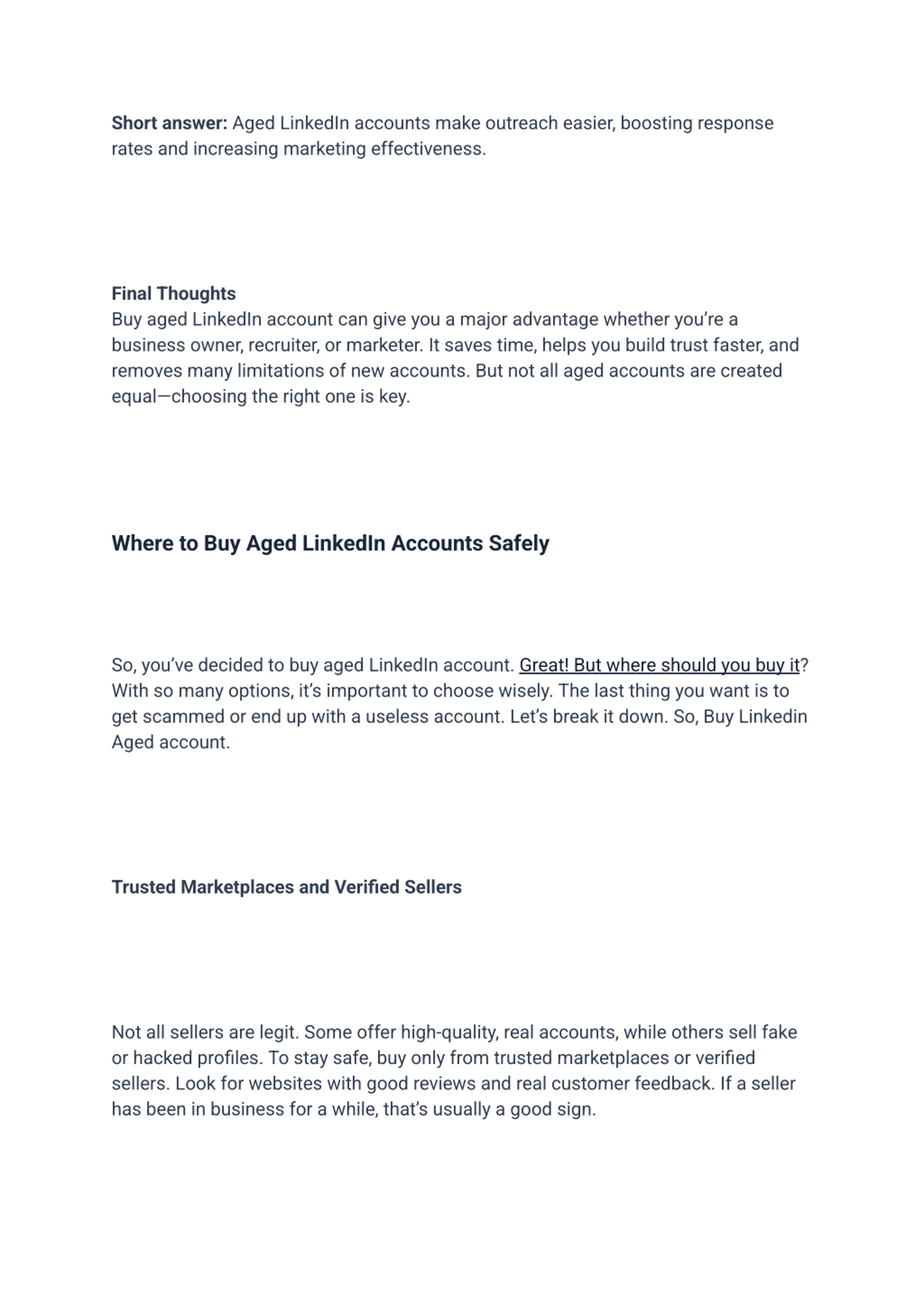 Key Factors to Check Before Buying Before making a purchase, do some homework. Check the account s age, activity, and connections. A good-aged LinkedIn account should have a natural history, meaning it has real interactions and not just random connections. Also, ask if you can change the email and password. If the seller refuses, that s a red flag. A quick tip: Pick an account with a history of engagement and ensure you can fully control it after purchase. Red Flags to Avoid Scammers are everywhere, so be careful. If an account is too cheap, it s probably fake or banned. Avoid sellers who won t provide details about the account s history. Another warning sign? If they rush you into buying without answering your questions. Take your time and only buy when you feel confident. So, Buy Linkedin Aged account. Final Thoughts