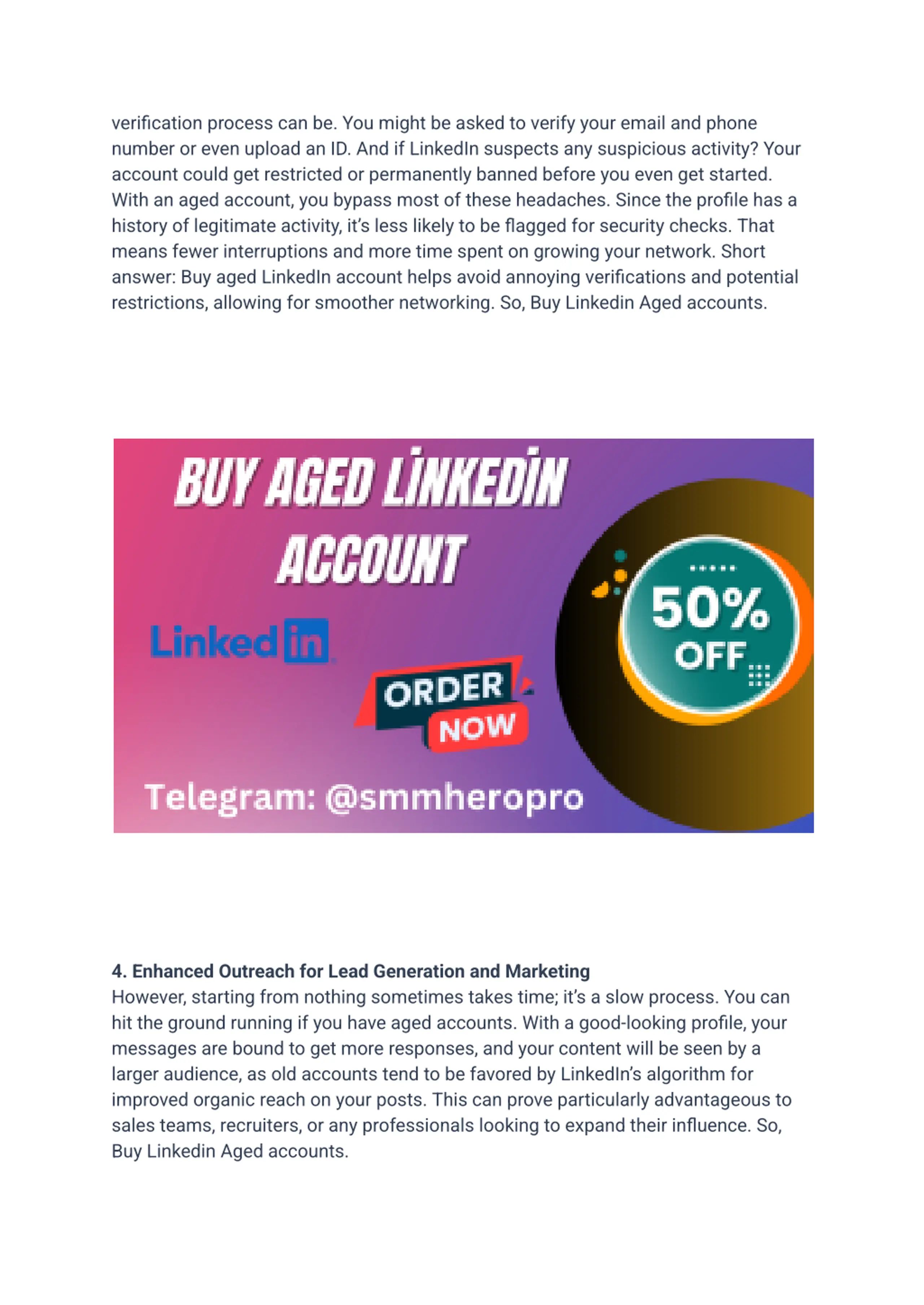 verification process can be. You might be asked to verify your email and phone number or even upload an ID. And if LinkedIn suspects any suspicious activity? Your account could get restricted or permanently banned before you even get started. With an aged account, you bypass most of these headaches. Since the profile has a history of legitimate activity, it s less likely to be flagged for security checks. That means fewer interruptions and more time spent on growing your network. Short answer: Buy aged LinkedIn account helps avoid annoying verifications and potential restrictions, allowing for smoother networking. So, Buy Linkedin Aged accounts. 4. Enhanced Outreach for Lead Generation and Marketing However, starting from nothing sometimes takes time; it s a slow process. You can hit the ground running if you have aged accounts. With a good-looking profile, your messages are bound to get more responses, and your content will be seen by a larger audience, as old accounts tend to be favored by LinkedIn s algorithm for improved organic reach on your posts. This can prove particularly advantageous to sales teams, recruiters, or any professionals looking to expand their influence. So, Buy Linkedin Aged accounts.