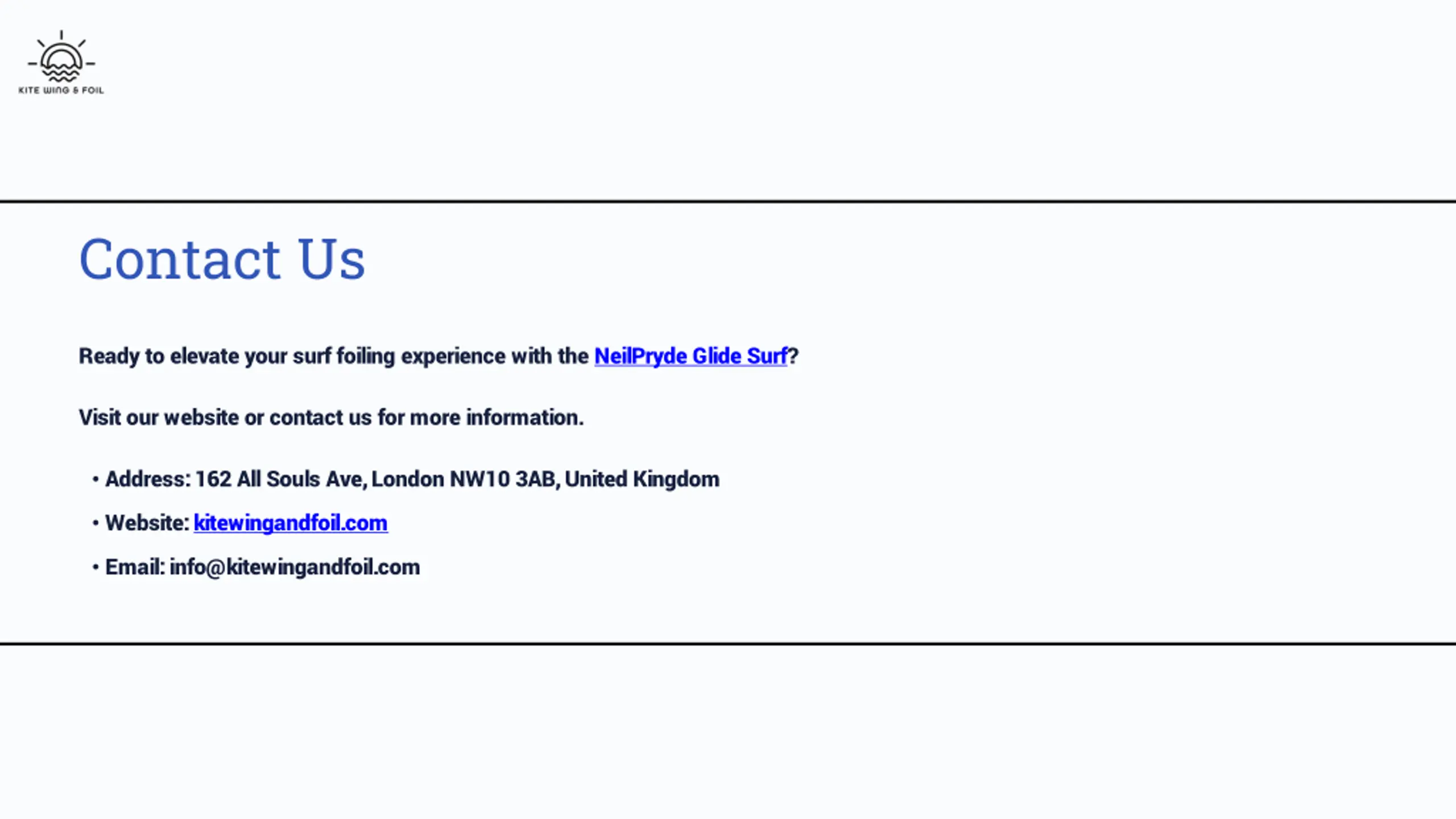 Contact Us Ready to elevate your surf foiling experience with the NeilPryde Glide Surf? Visit our website or contact us for more information. Address: 162 All Souls Ave, London NW10 3AB, United Kingdom Website: kitewingandfoil.com Email: info@kitewingandfoil.com