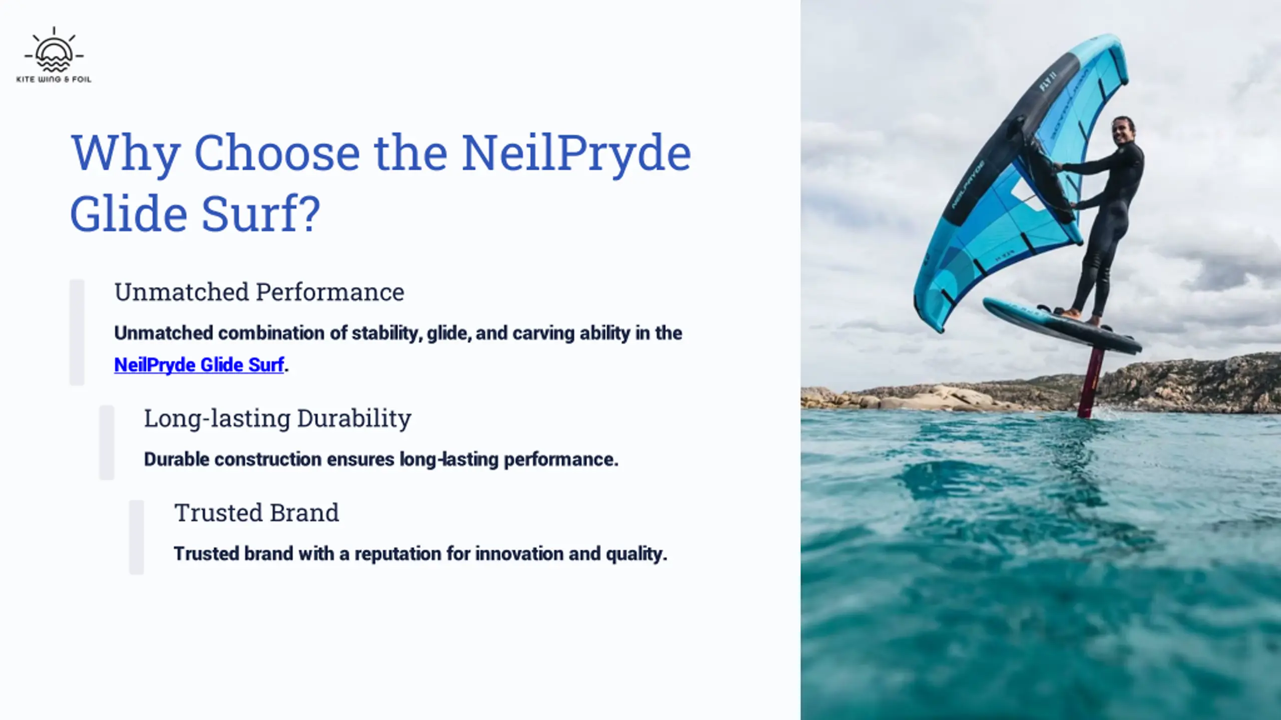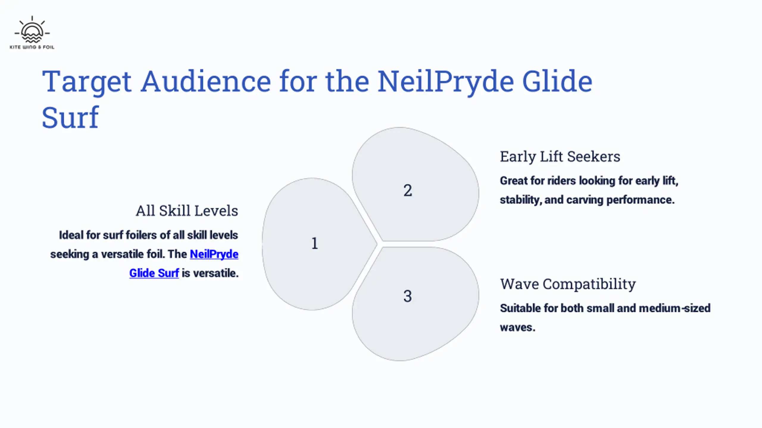 Target Audience for the NeilPryde Glide Surf Early Lift Seekers Great for riders looking for early lift, stability, and carving performance. 2 All Skill Levels Ideal for surf foilers of all skill levels seeking a versatile foil. The NeilPryde Glide Surf is versatile. 1 Wave Compatibility 3 Suitable for both small and medium-sized waves.