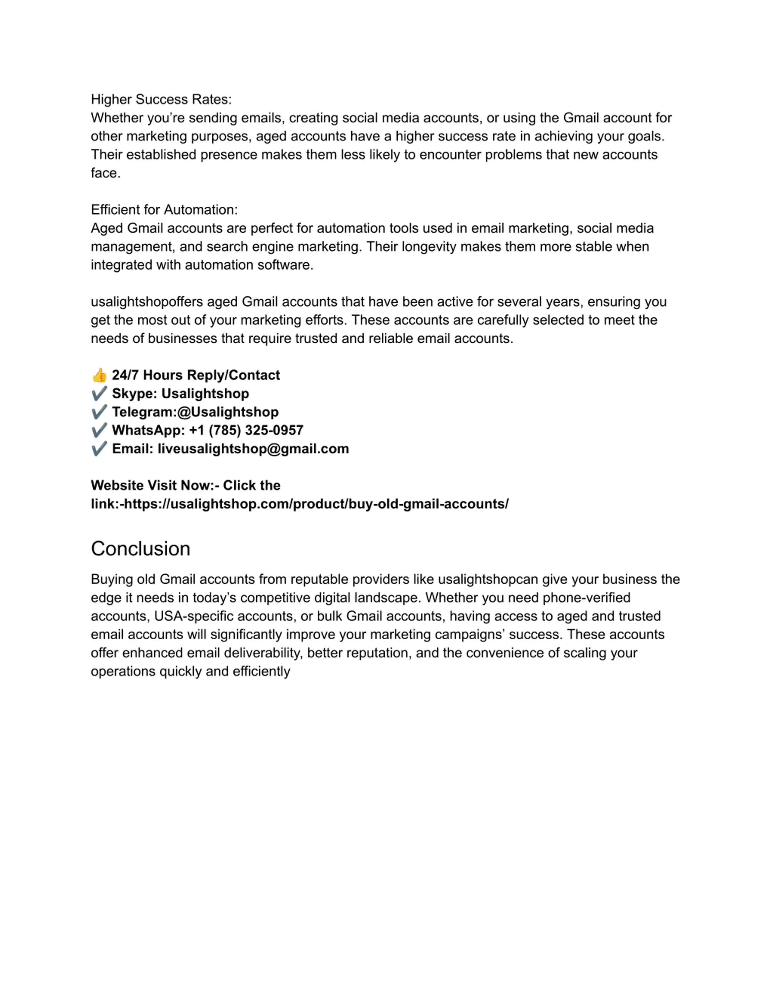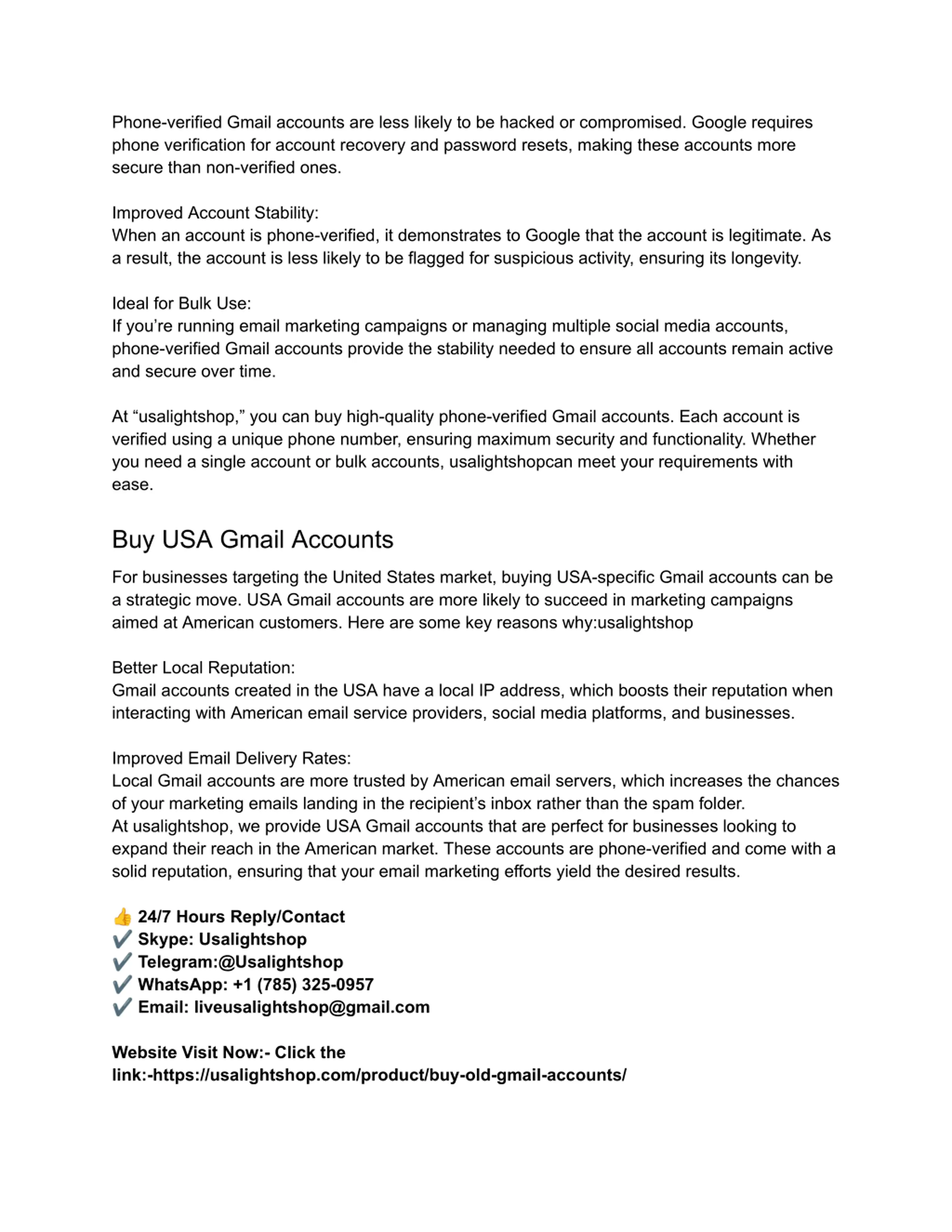 Higher Success Rates: Whether you re sending emails, creating social media accounts, or using the Gmail account for other marketing purposes, aged accounts have a higher success rate in achieving your goals. Their established presence makes them less likely to encounter problems that new accounts face. Efficient for Automation: Aged Gmail accounts are perfect for automation tools used in email marketing, social media management, and search engine marketing. Their longevity makes them more stable when integrated with automation software. usalightshopoffers aged Gmail accounts that have been active for several years, ensuring you get the most out of your marketing efforts. These accounts are carefully selected to meet the needs of businesses that require trusted and reliable email accounts. ? 24/7 Hours Reply/Contact Skype: Usalightshop Telegram:@Usalightshop WhatsApp: +1 (785) 325-0957 Email: liveusalightshop@gmail.com Website Visit Now:- Click the link:-https://usalightshop.com/product/buy-old-gmail-accounts/ Conclusion Buying old Gmail accounts from reputable providers like usalightshopcan give your business the edge it needs in today s competitive digital landscape. Whether you need phone-verified accounts, USA-specific accounts, or bulk Gmail accounts, having access to aged and trusted email accounts will significantly improve your marketing campaigns success. These accounts offer enhanced email deliverability, better reputation, and the convenience of scaling your operations quickly and efficiently