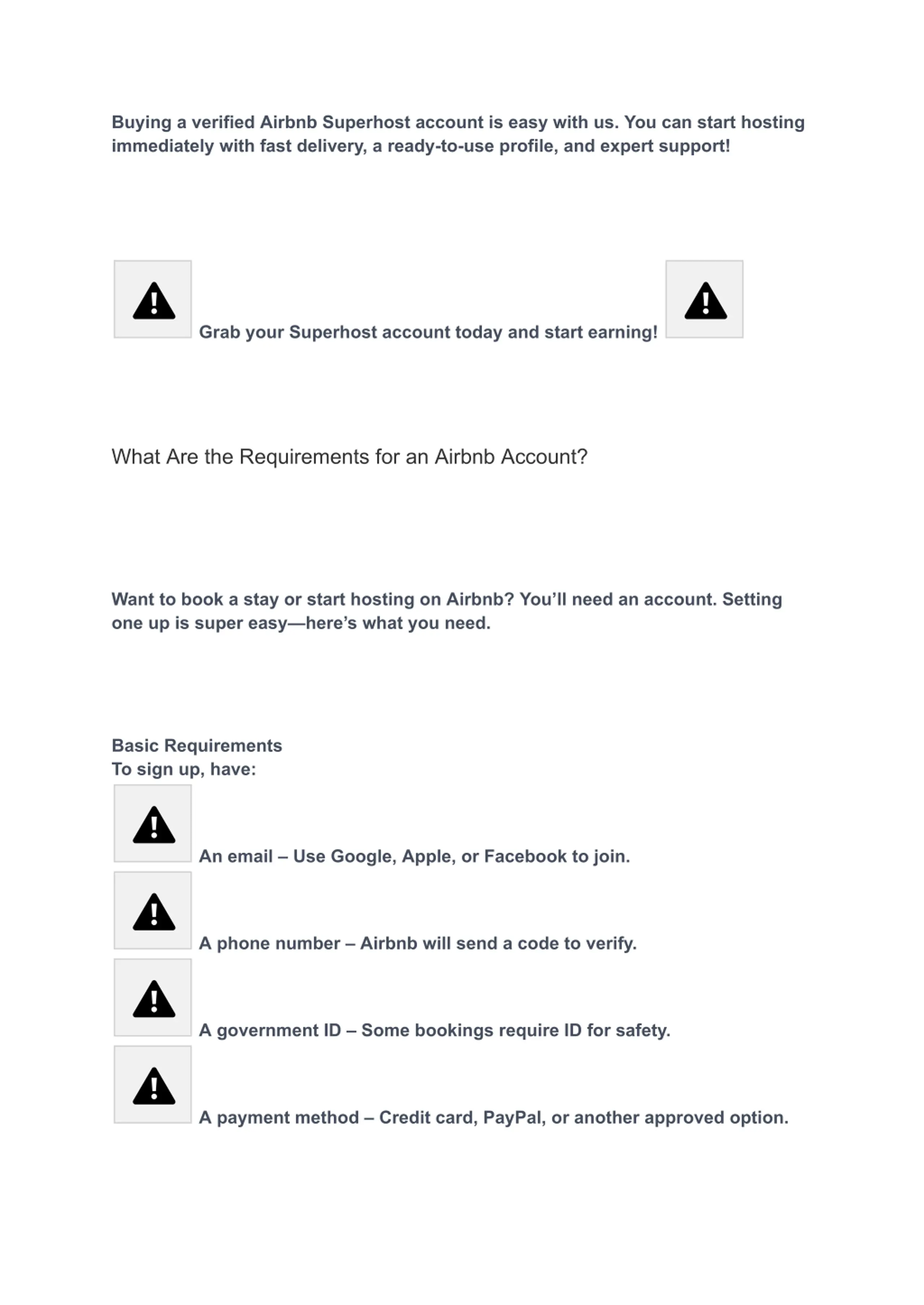 Buying a verified Airbnb Superhost account is easy with us. You can start hosting immediately with fast delivery, a ready-to-use profile, and expert support! Grab your Superhost account today and start earning! What Are the Requirements for an Airbnb Account? Want to book a stay or start hosting on Airbnb? You ll need an account. Setting one up is super easy here s what you need. Basic Requirements To sign up, have: An email Use Google, Apple, or Facebook to join. A phone number Airbnb will send a code to verify. A government ID Some bookings require ID for safety. A payment method Credit card, PayPal, or another approved option.