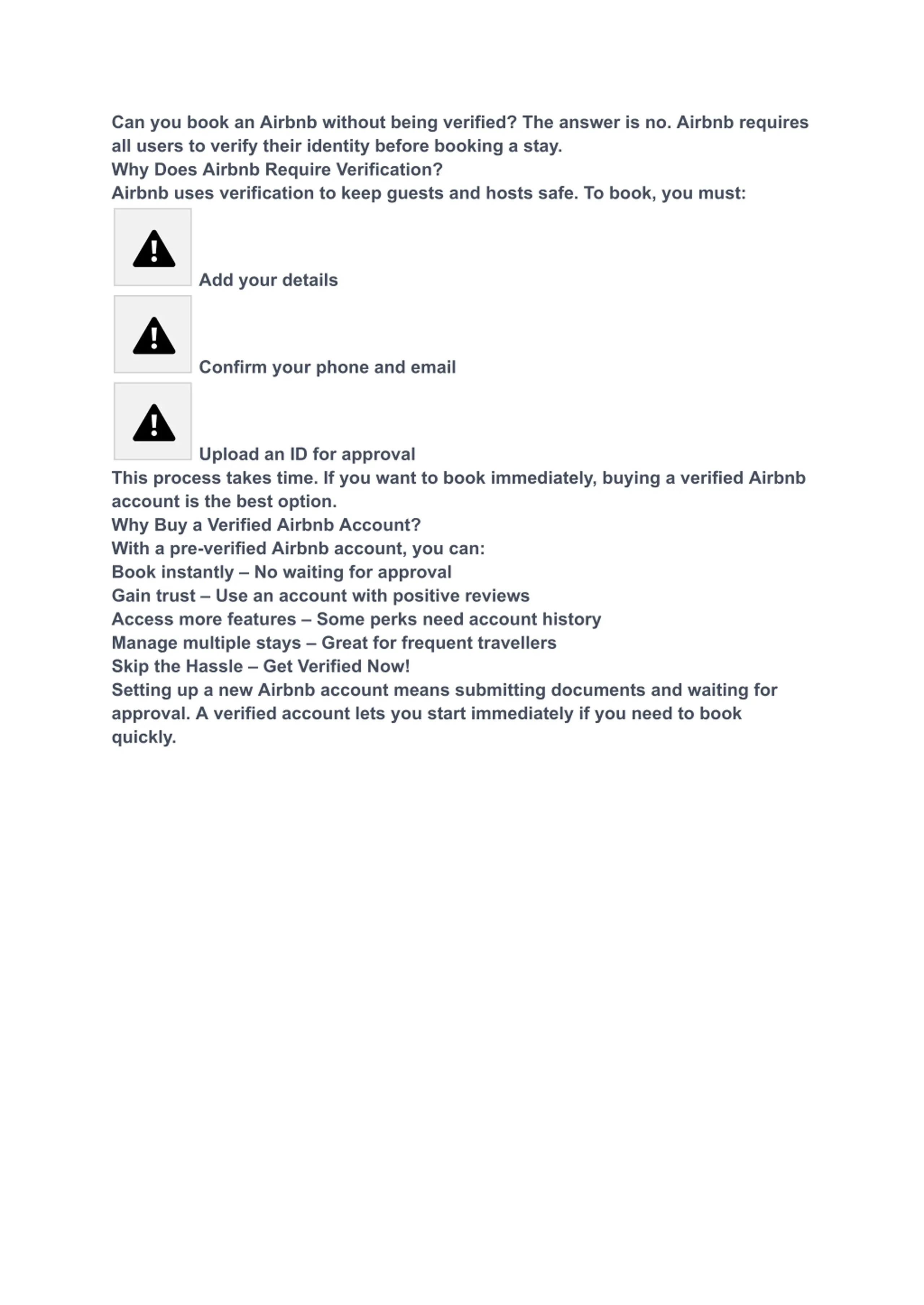 Can you book an Airbnb without being verified? The answer is no. Airbnb requires all users to verify their identity before booking a stay. Why Does Airbnb Require Verification? Airbnb uses verification to keep guests and hosts safe. To book, you must: Add your details Confirm your phone and email Upload an ID for approval This process takes time. If you want to book immediately, buying a verified Airbnb account is the best option. Why Buy a Verified Airbnb Account? With a pre-verified Airbnb account, you can: Book instantly No waiting for approval Gain trust Use an account with positive reviews Access more features Some perks need account history Manage multiple stays Great for frequent travellers Skip the Hassle Get Verified Now! Setting up a new Airbnb account means submitting documents and waiting for approval. A verified account lets you start immediately if you need to book quickly.
